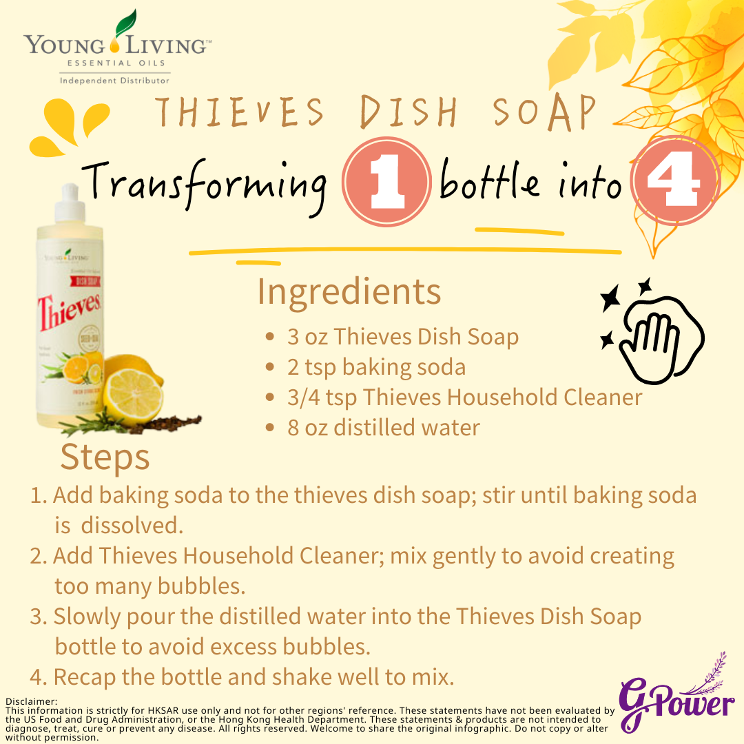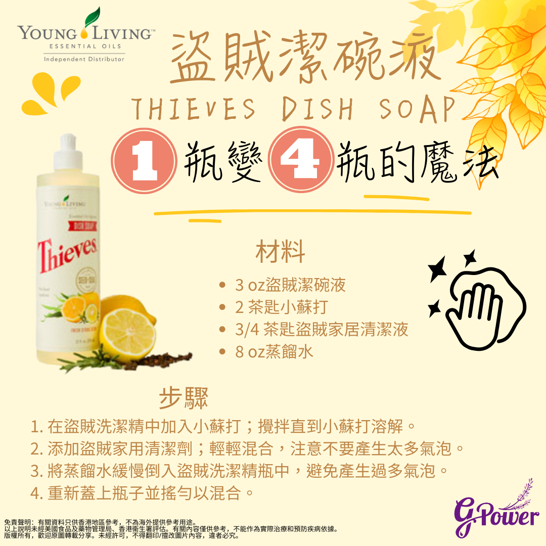 1)盜賊潔碗液的表面活性劑(Surfactants) 是天然提取的,不但可生物降解,亦不會刺激您的皮膚。盜賊潔碗液的配方將表面活性劑與天然鹽配對,以提高清潔效能!