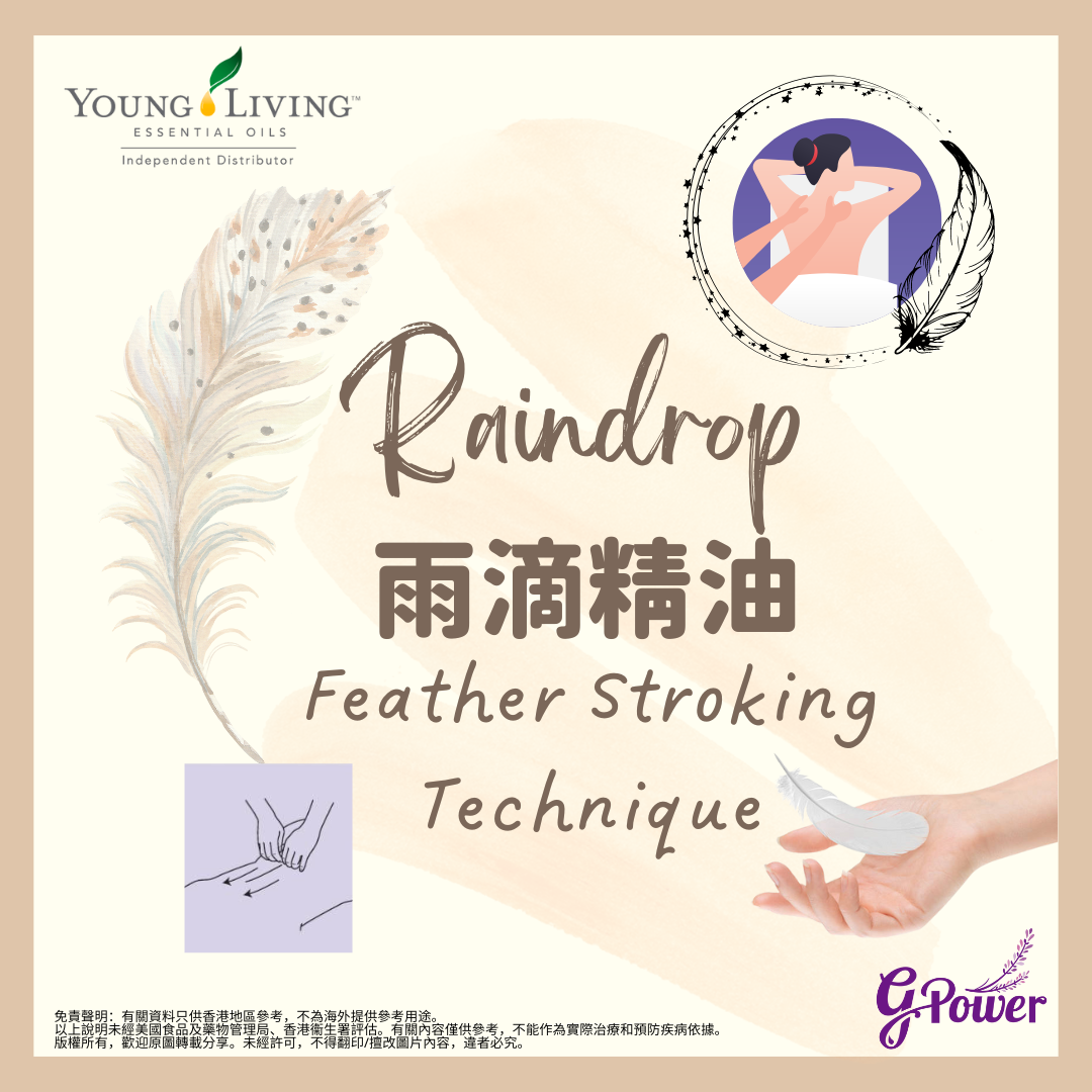 Raindrop雨滴精油是會員最愛的精油套裝之一,除了把精油塗抹在腳底,營造和諧、恢復活力和平衡的環境,也可使用Feather Stroking Technique(羽毛手掃/撫摸法)把精油塗抹在身上,以加強效果。