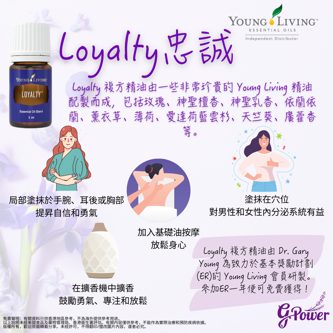 Loyalty 複方精油由一些非常珍貴的 Young Living 精油配製而成,包括玫瑰、神聖檀香、神聖乳香、依蘭依蘭、薰衣草、薄荷、愛達荷藍雲杉、天竺葵、廣藿香等。