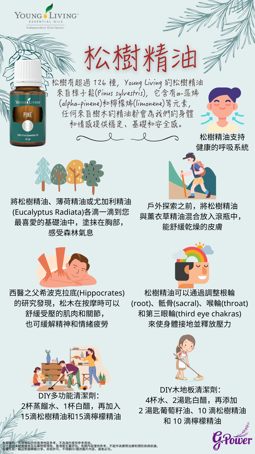 松樹有超過 126 種,Young Living 的松樹精油來自樟子鬆(Pinus sylvestris),它含有α-蒎烯(alpha-pinene)和檸檬烯(limonene)等元素,任何來自樹木的精油都會為我們的身體和情感提供穩定、基礎和安全感。