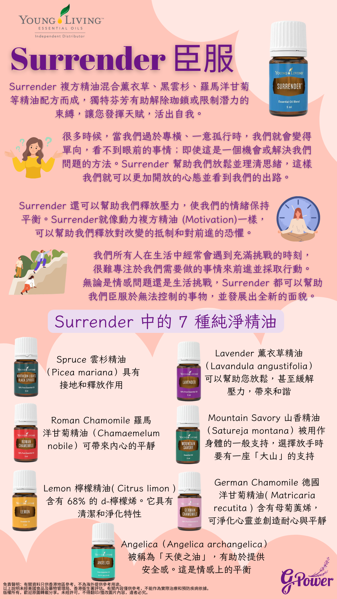 Surrender 複方精油混合薰衣草、黑雲杉、羅馬洋甘菊等精油配方而成,獨特芬芳有助解除珈鎖或限制潛力的束縛,讓您發揮天賦,活出自我。