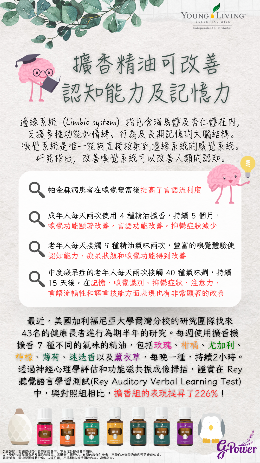 💫 最近,美國加利福尼亞大學爾灣分校的研究團隊找來43名的健康長者進行為期半年的研究。每週使用擴香機擴香 7 種不同的氣味的精油,包括玫瑰、柑橘、尤加利、檸檬、薄荷、迷迭香以及薰衣草,每晚一種,持續 2 小時。透過神經心理學評估和功能磁共振成像掃描,證實在 Rey 聽覺語言學習測試 (Rey Auditory Verbal Learning Test) 中,與對照組相比,擴香組的表現提昇了226%!