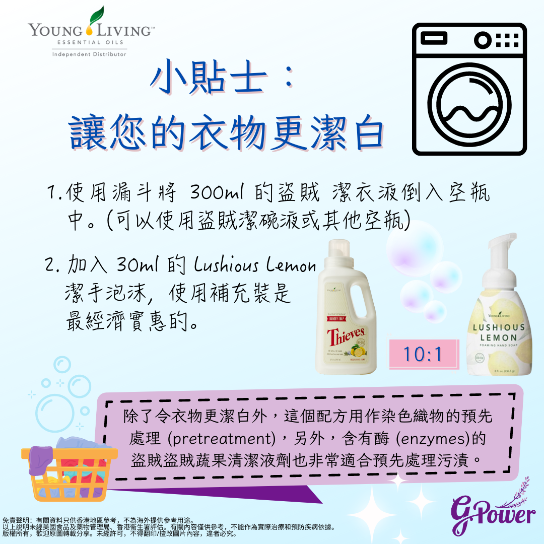 想獲得更潔白的白色,可以將盜賊潔衣液與 Lushious Lemon 潔手泡沫(Lushious Lemon Foaming hand soap)混合。