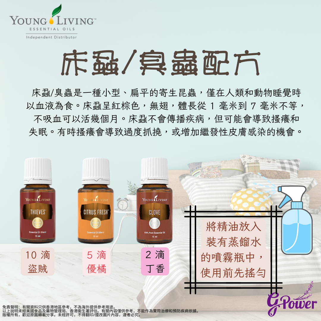 所有精油化合物直接作用於臭蟲時都有效,儘管殺死臭蟲所需的量各不相同。源自牛至和百里香的香芹酚(Carvacrol);百里香酚(thymol,百里香);香茅酸(citronellic acid,檸檬草);和丁香酚(eugenol,丁香)最有效。