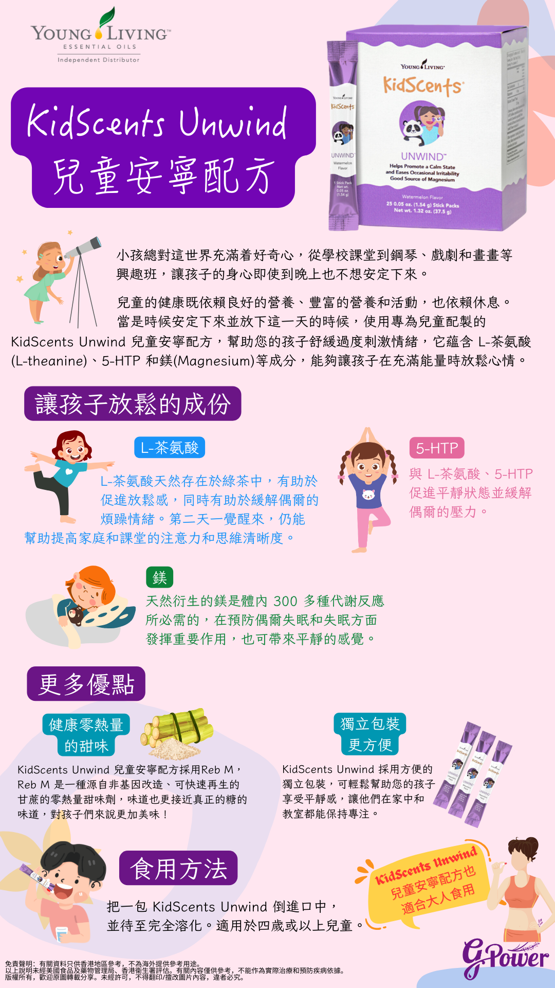 兒童的健康既依賴良好的營養、豐富的營養和活動,也依賴休息。當是時候安定下來並放下這一天的時候,使用專為兒童配製的 KidScents Unwind 兒童安寧配方,幫助您的孩子舒緩過度刺激情緒,它蘊含 L-茶氨酸(L-theanine)、5-HTP 和鎂(Magnesium)等成分,能夠讓你的孩子在充滿能量時放鬆心情。
