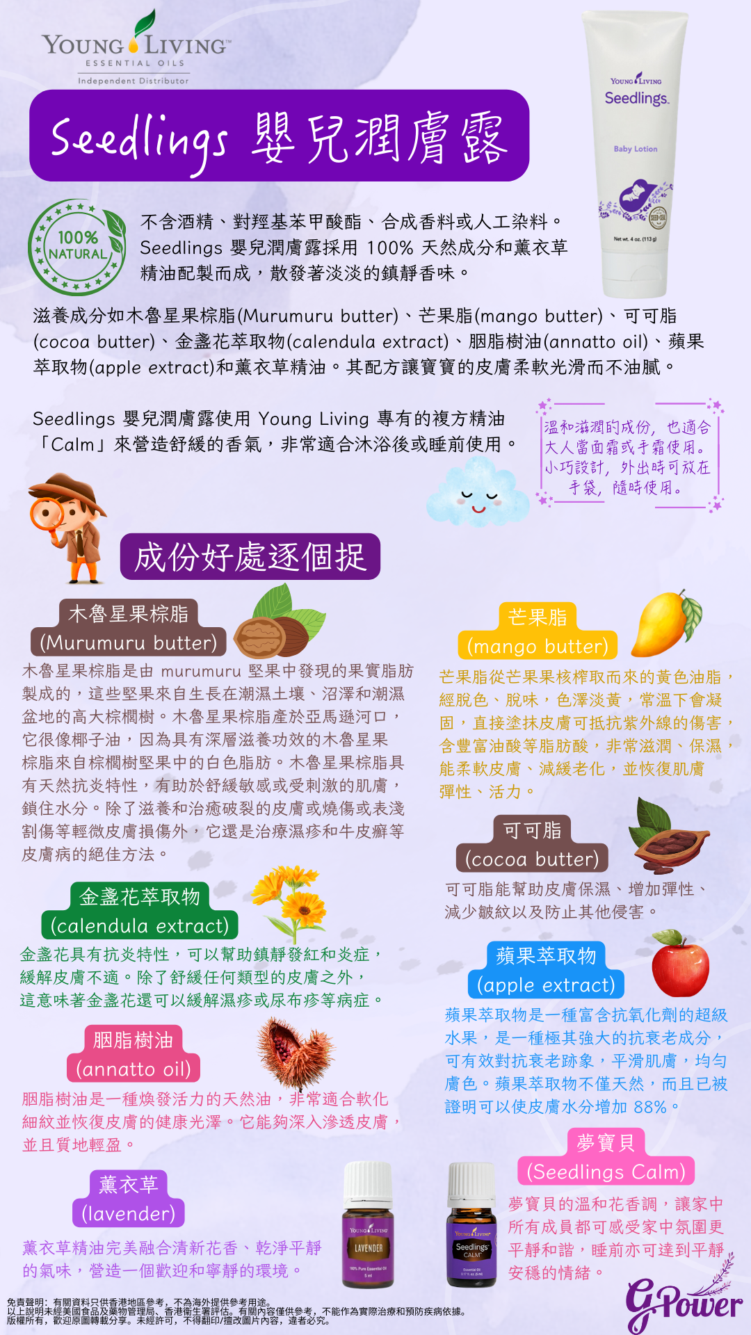 Seedlings 嬰兒潤膚露使用 Young Living 專有的複方精油「Calm」來營造舒緩的香氣,非常適合沐浴後或睡前使用。