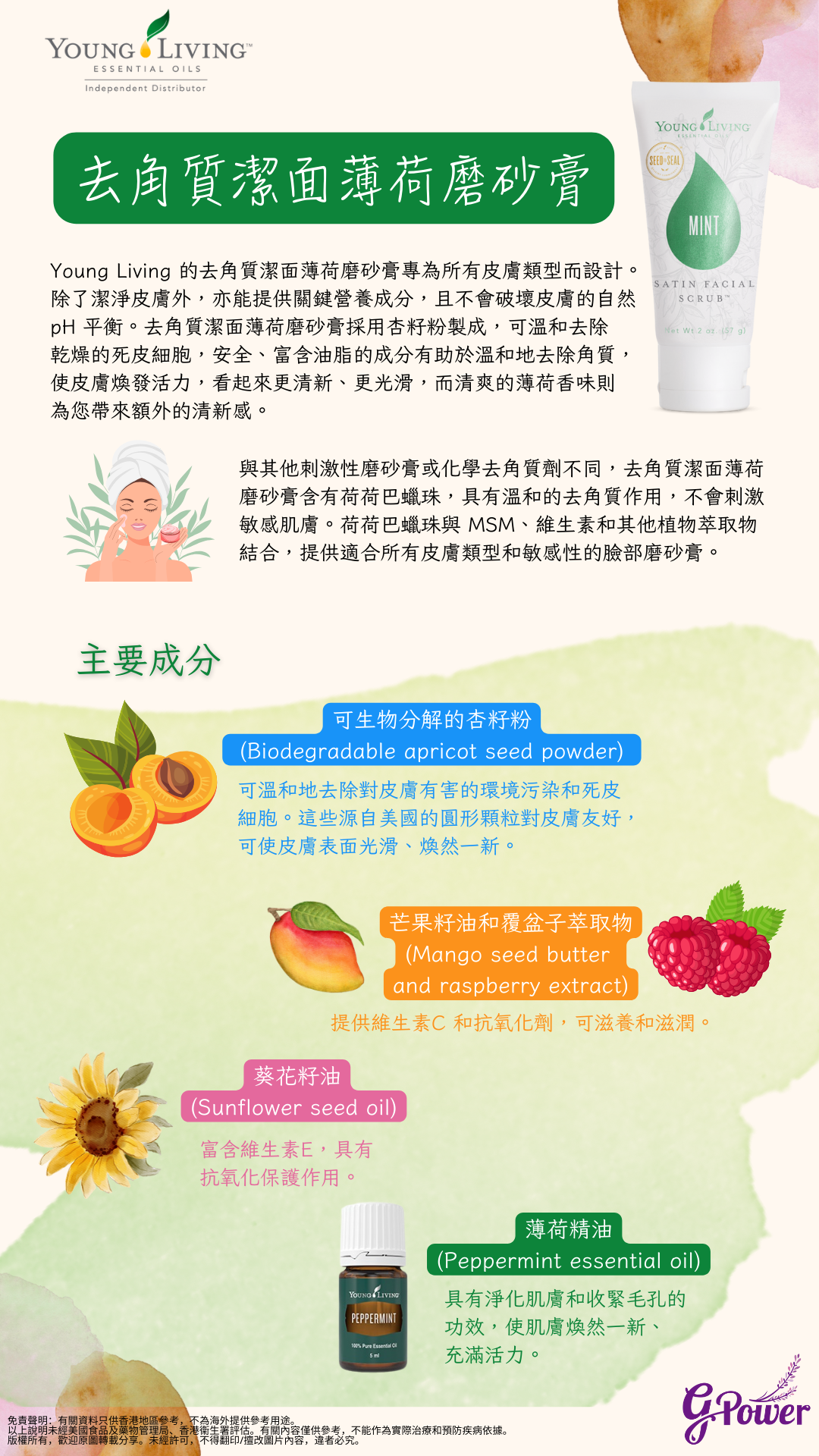 Young Living 的去角質潔面薄荷磨砂膏專為所有皮膚類型而設計。除了潔淨皮膚外,亦能提供關鍵營養成分,且不會破壞皮膚的自然 pH 平衡。去角質潔面薄荷磨砂膏採用杏籽粉製成,可溫和去除乾燥的死皮細胞,安全、富含油脂的成分有助於溫和地去除角質,使皮膚煥發活力,看起來更清新、更光滑,而清爽的薄荷香味則為您帶來額外的清新感。