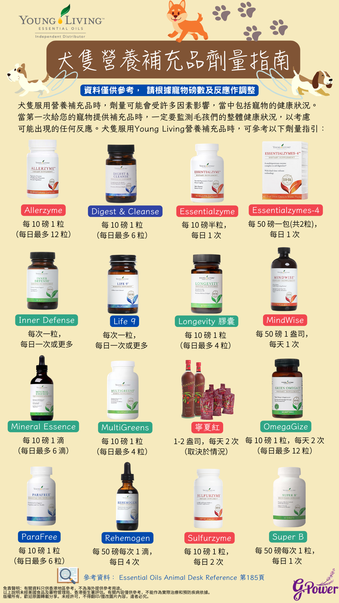 犬隻服用Young Living營養補充品時,可參考以下劑量指引:
