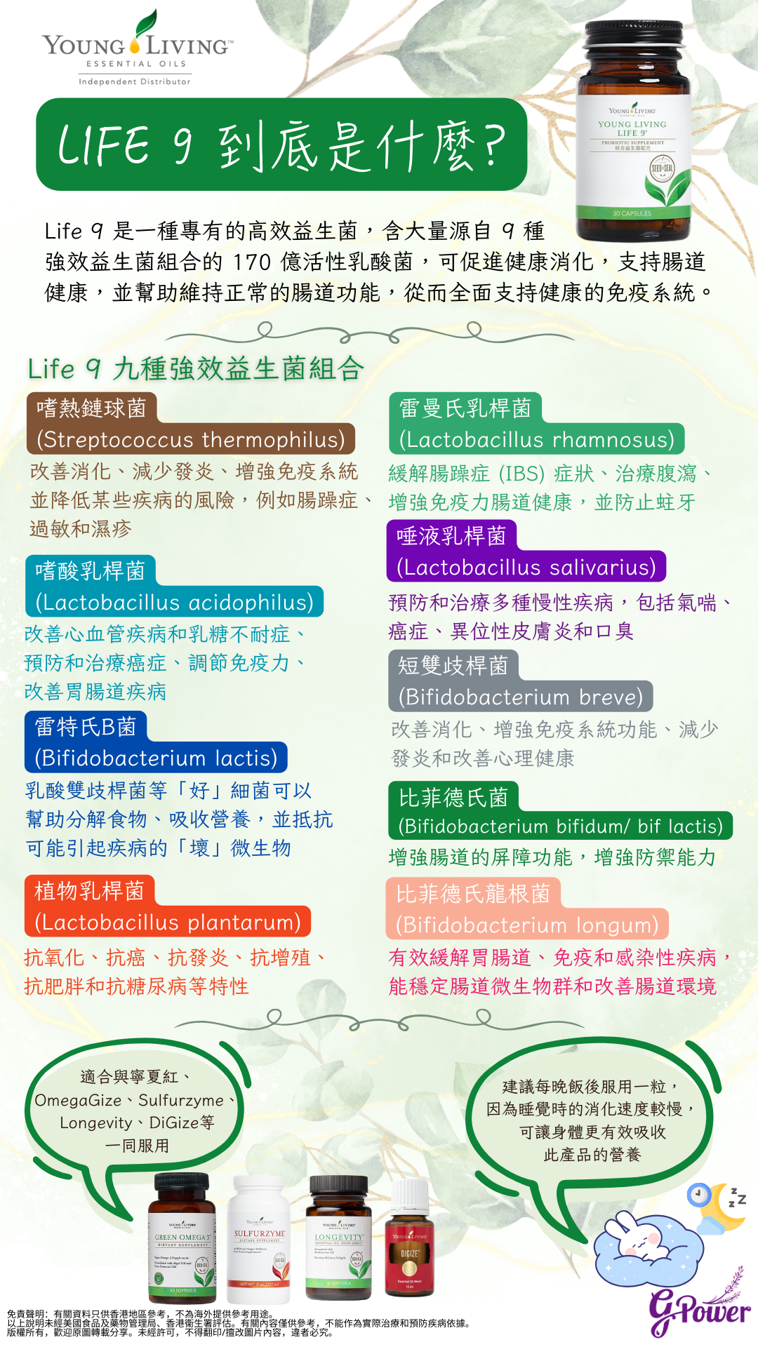 Life 9 是一種專有的高效益生菌,含大量源自 9 種強效益生菌組合的 170 億活性乳酸菌,可促進健康消化,支持腸道健康,並幫助維持正常的腸道功能,從而全面支持健康的免疫系統。