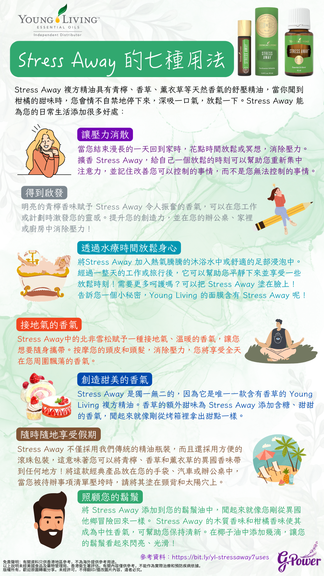 將Stress Away 加入熱氣騰騰的沐浴水中或舒適的足部浸泡中。經過一整天的工作或旅行後,它可以幫助您平靜下來並享受一些放鬆時刻!需要更多呵護嗎?可以把 Stress Away 塗在臉上!告訴您一個小秘密,Young Living 的面膜含有 Stress Away 呢!