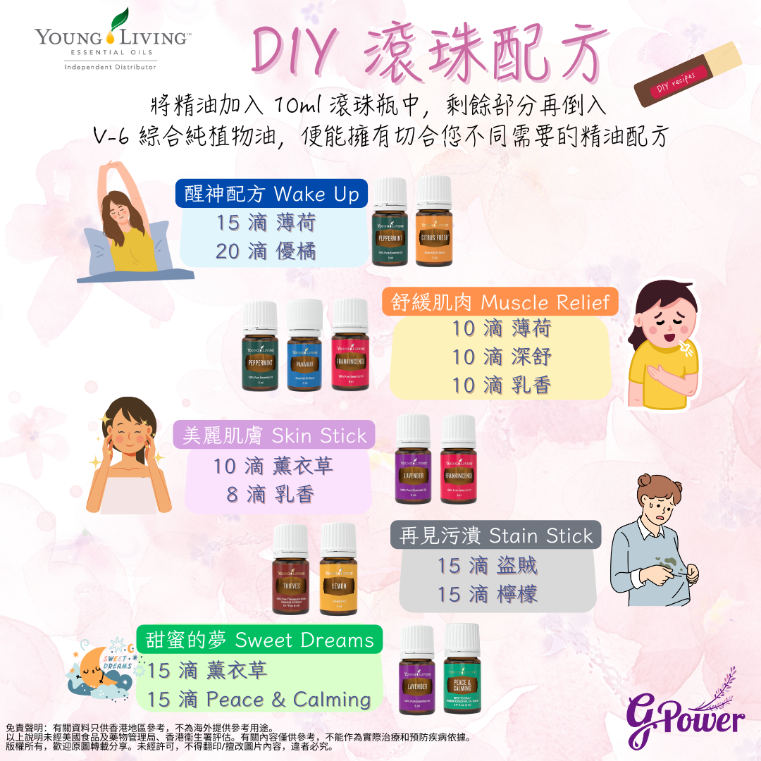將精油加入 10ml 滾珠瓶中,剩餘部分再倒入 V-6 綜合純植物油,便能擁有切合您不同需要的精油配方