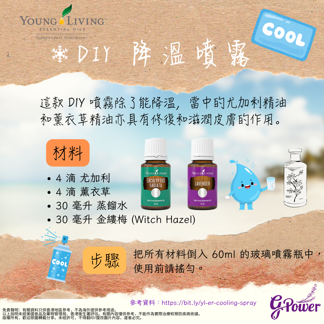 這款 DIY 噴霧除了能降溫,當中的尤加利精油和薰衣草精油亦具有修復和滋潤皮膚的作用。