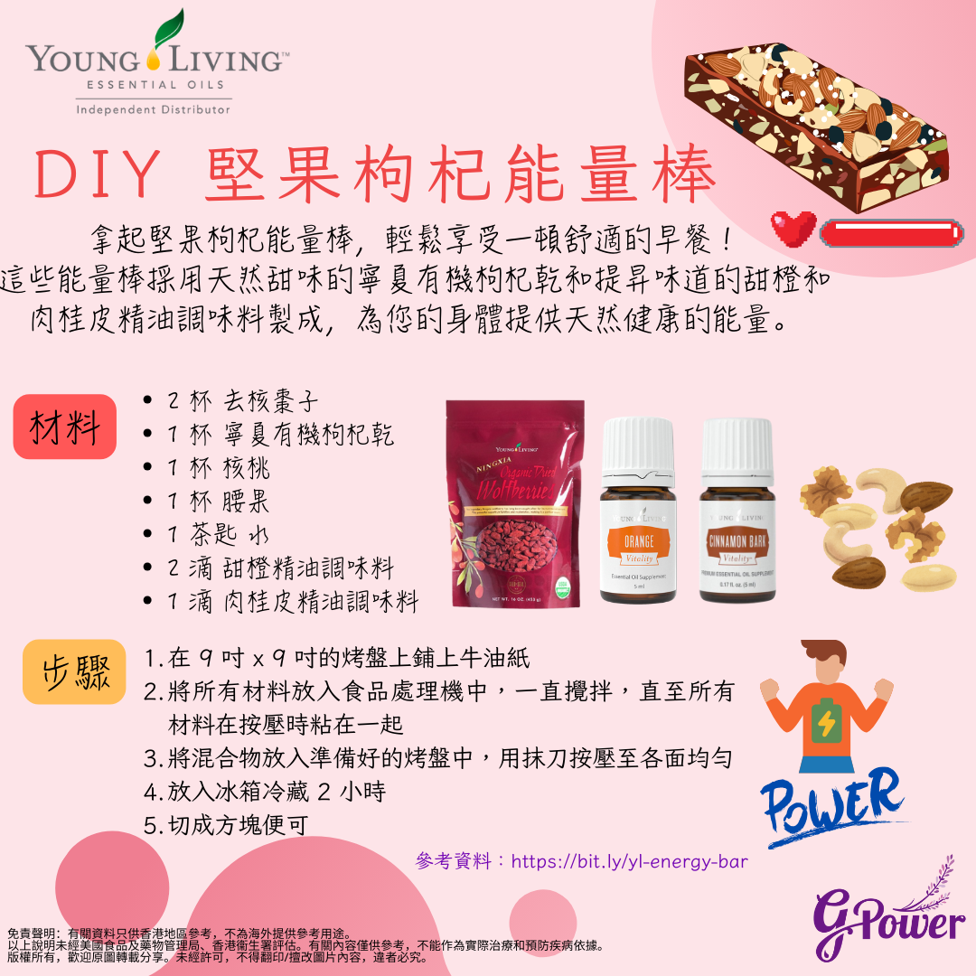 拿起堅果枸杞能量棒,輕鬆享受一頓舒適的早餐!這些能量棒採用天然甜味的寧夏有機枸杞乾和提昇味道的甜橙和肉桂皮精油調味料製成,為您的身體提供天然健康的能量。