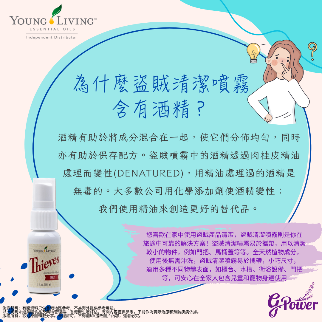 酒精有助於將成分混合在一起,使它們分佈均勻,同時亦有助於保存配方。盜賊噴霧中的酒精透過肉桂皮精油處理而變性(denatured),用精油處理過的酒精是無毒的。大多數公司用化學添加劑使酒精變性;我們使用精油來創造更好的替代品。