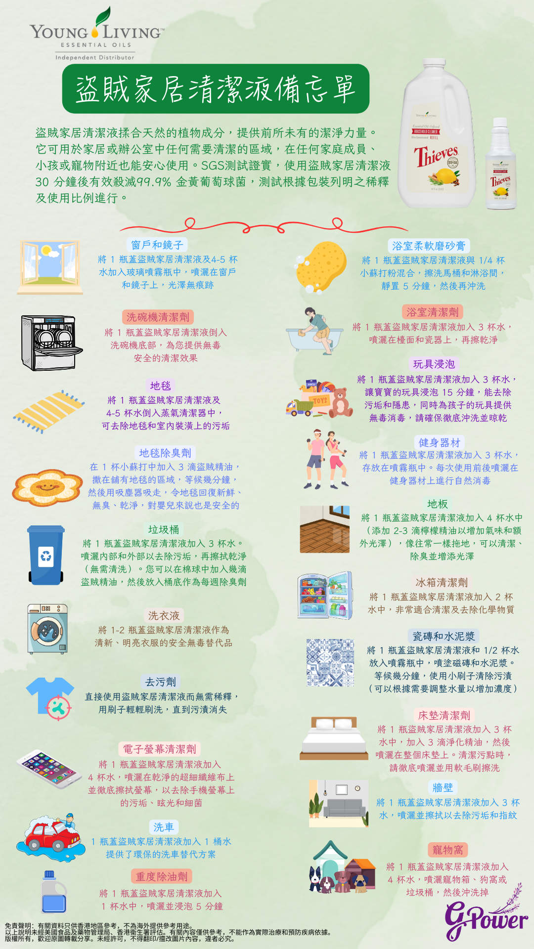 將 1 瓶蓋盜賊家居清潔液及4-5 杯水加入玻璃噴霧瓶中,噴灑在窗戶和鏡子上,光澤無痕跡。