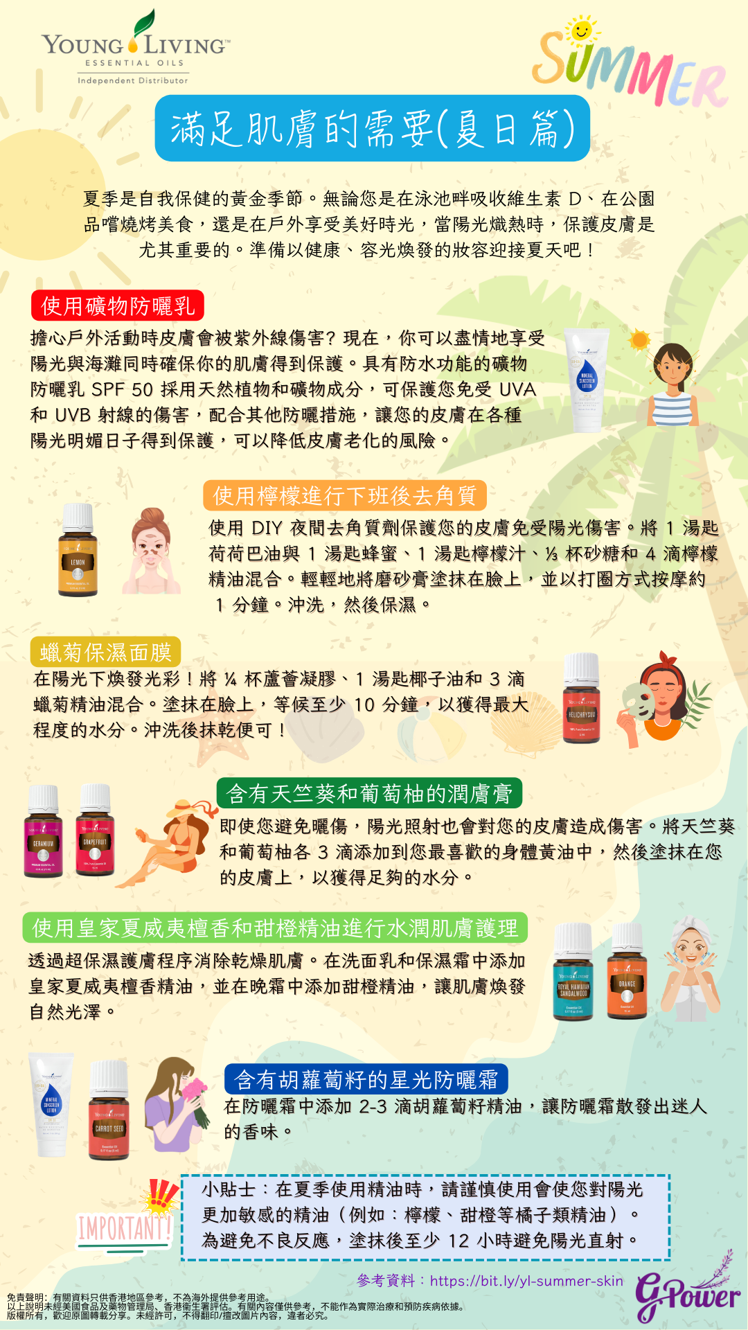 小貼士:在夏季使用精油時,請謹慎使用會使您對陽光更加敏感的精油(檸檬、甜橙等橘子類精油)。為避免不良反應,塗抹後至少 12 小時避免陽光直射。