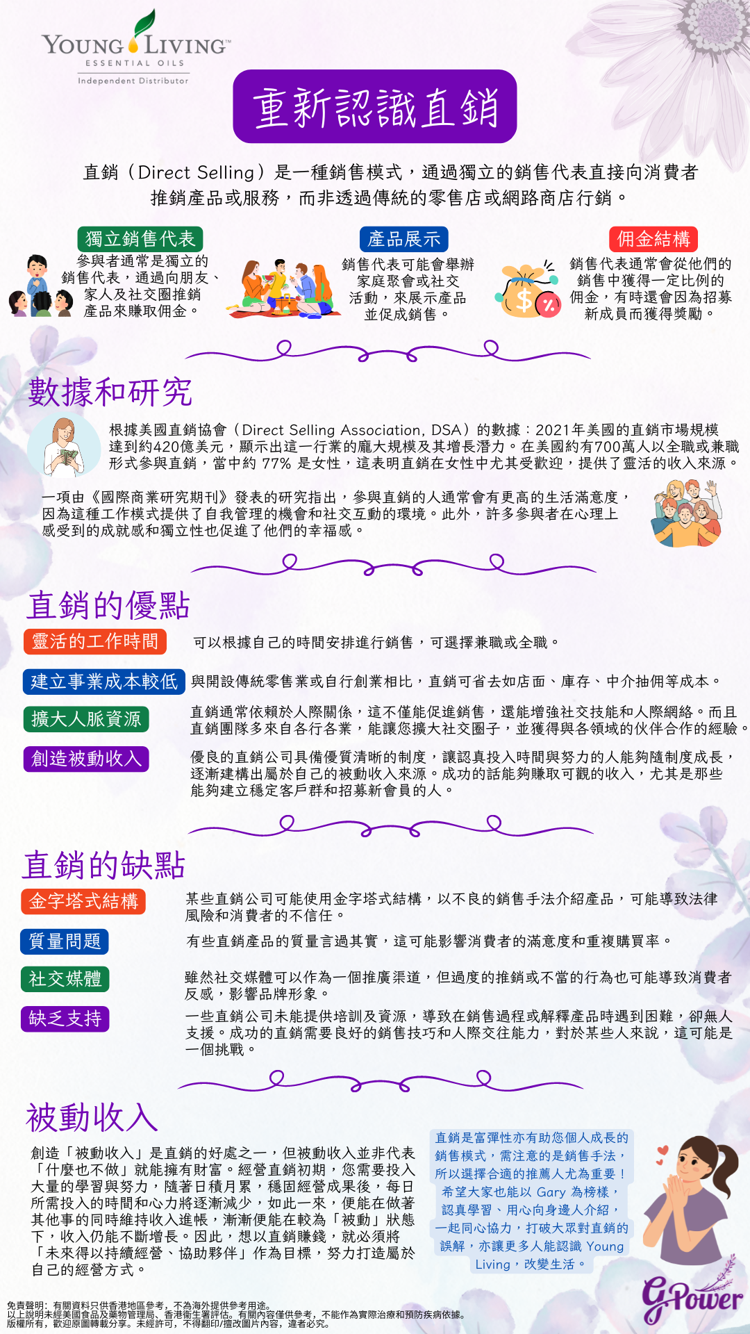 直銷是富彈性亦有助您個人成長的銷售模式,需注意的是銷售手法,所以選擇合適的推薦人尤為重要!希望大家也能以 Gary 為榜樣,認真學習、用心向身邊人介紹,一起同心協力,打破大眾對直銷的誤解,亦讓更多人能認識 Young Living,改變生活。
