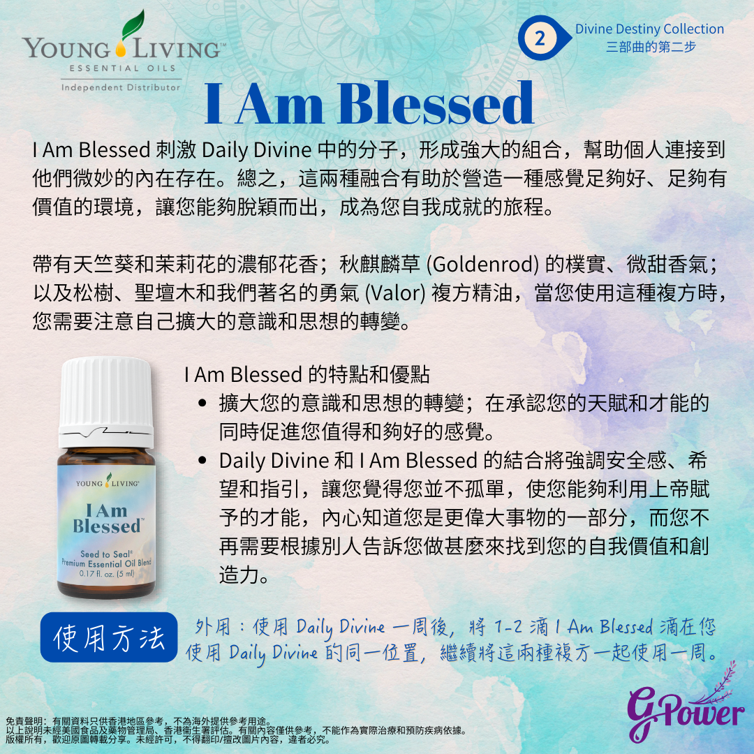 之前為大家介紹了Divine Destiny Collection 之中的 Daily Divine,您的感覺如何?使用 Daily Divine 一周探索自我後,便可以使用 Daily Divine 加上 I Am Blessed,進入感恩之旅~記得把 I Am Blessed 滴在您使用 Daily Divine 的同一位置(例如手腕、頸後、頂輪、喉嚨、心臟或耳垂),繼續將這兩種複方一起使用一周。