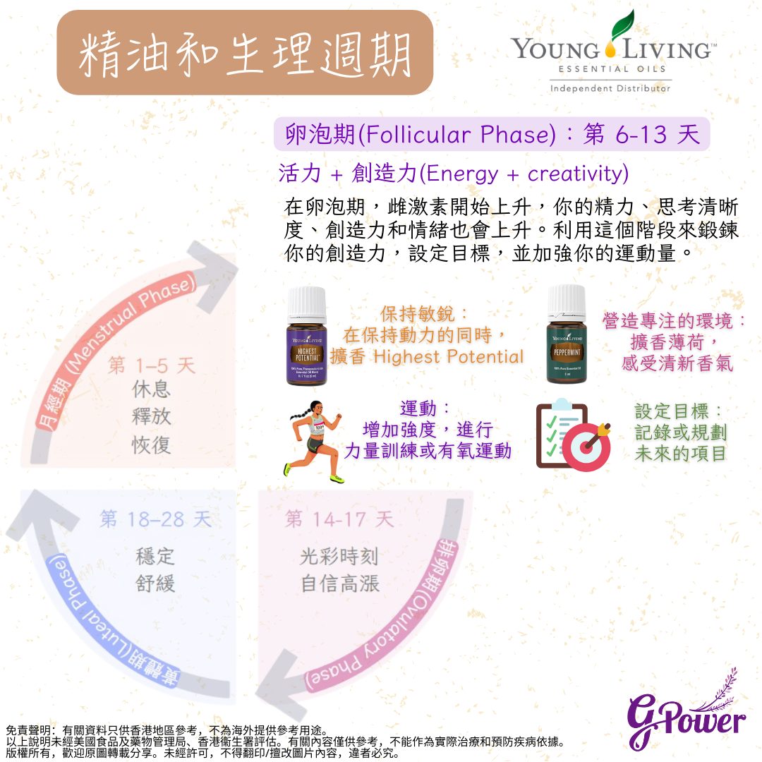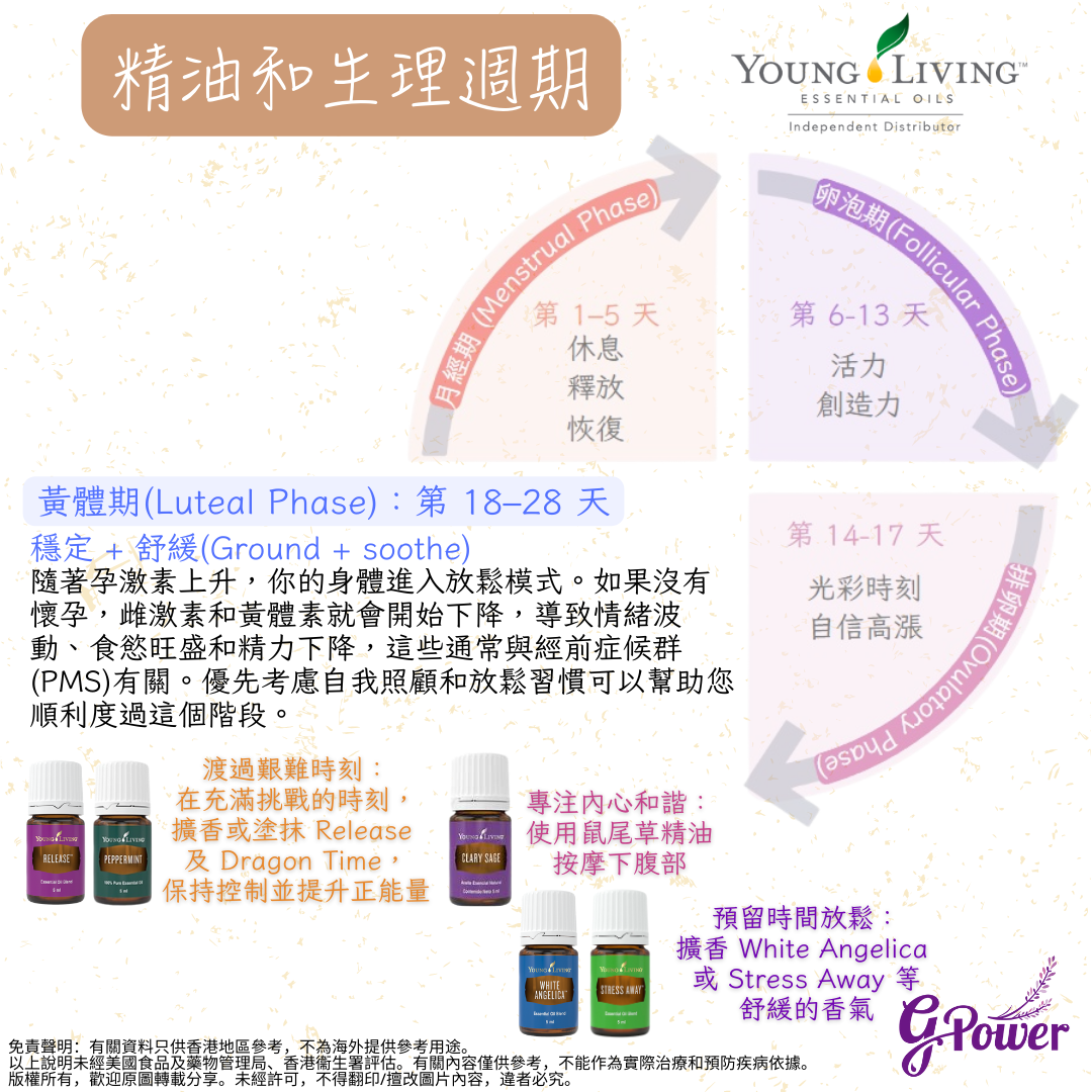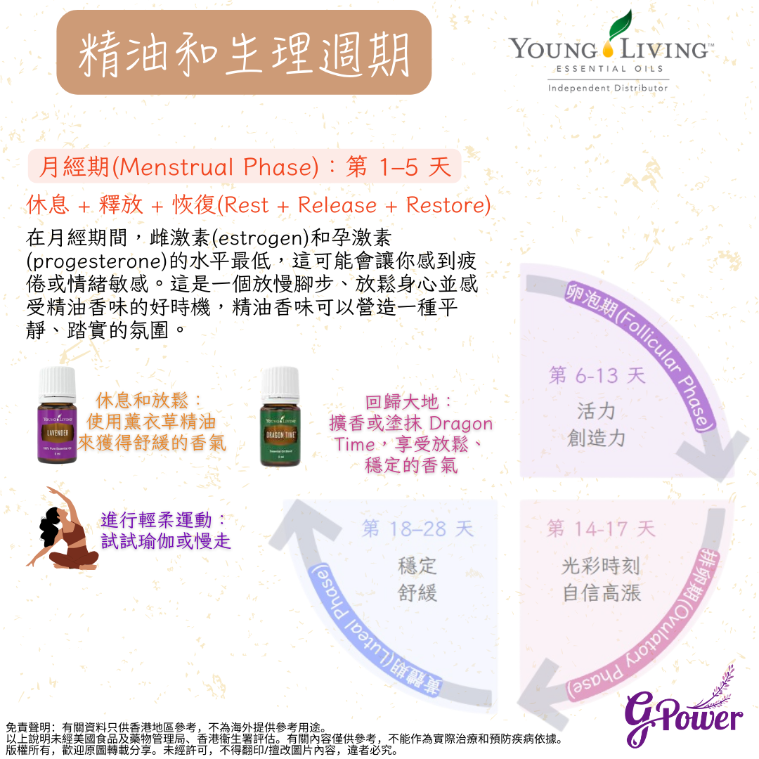 在月經期間,雌激素(estrogen)和孕激素(progesterone)的水平最低,這可能會讓你感到疲倦或情緒敏感。這是一個放慢腳步、放鬆身心並感受精油香味的好時機,精油香味可以營造一種平靜、踏實的氛圍。