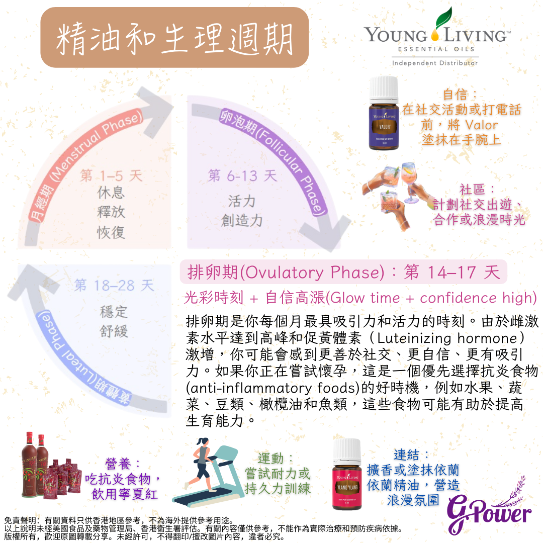 排卵期是你每個月最具吸引力和活力的時刻。由於雌激素水平達到高峰和促黃體素(Luteinizing hormone)激增,你可能會感到更善於社交、更自信、更有吸引力。如果你正在嘗試懷孕,這是一個優先選擇抗炎食物(anti-inflammatory foods)的好時機,例如水果、蔬菜、豆類、橄欖油和魚類,這些食物可能有助於提高生育能力。