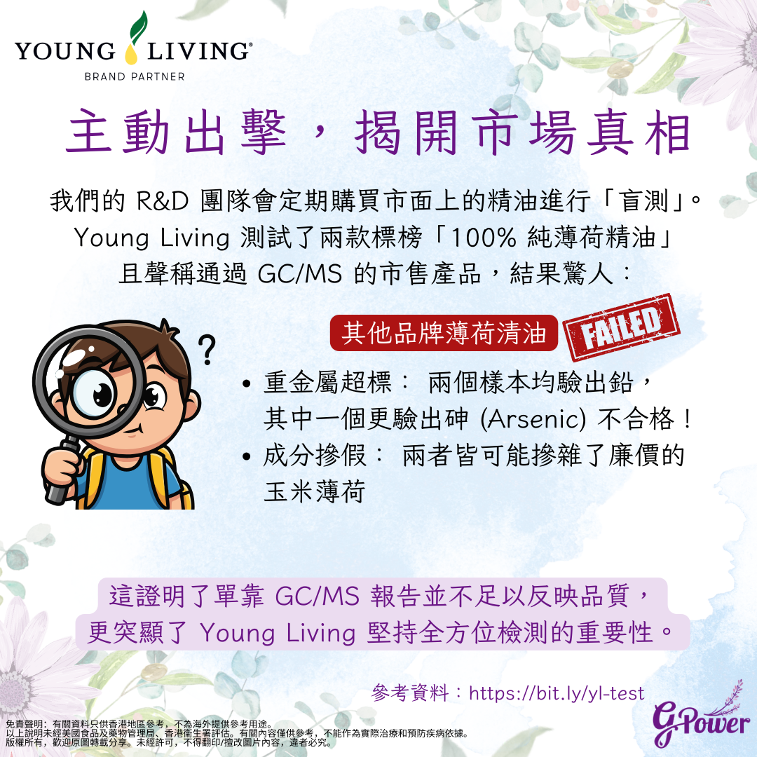 - 這證明了單靠 GC/MS 報告並不足以反映品質,更突顯了 Young Living 堅持全方位檢測的重要性。
