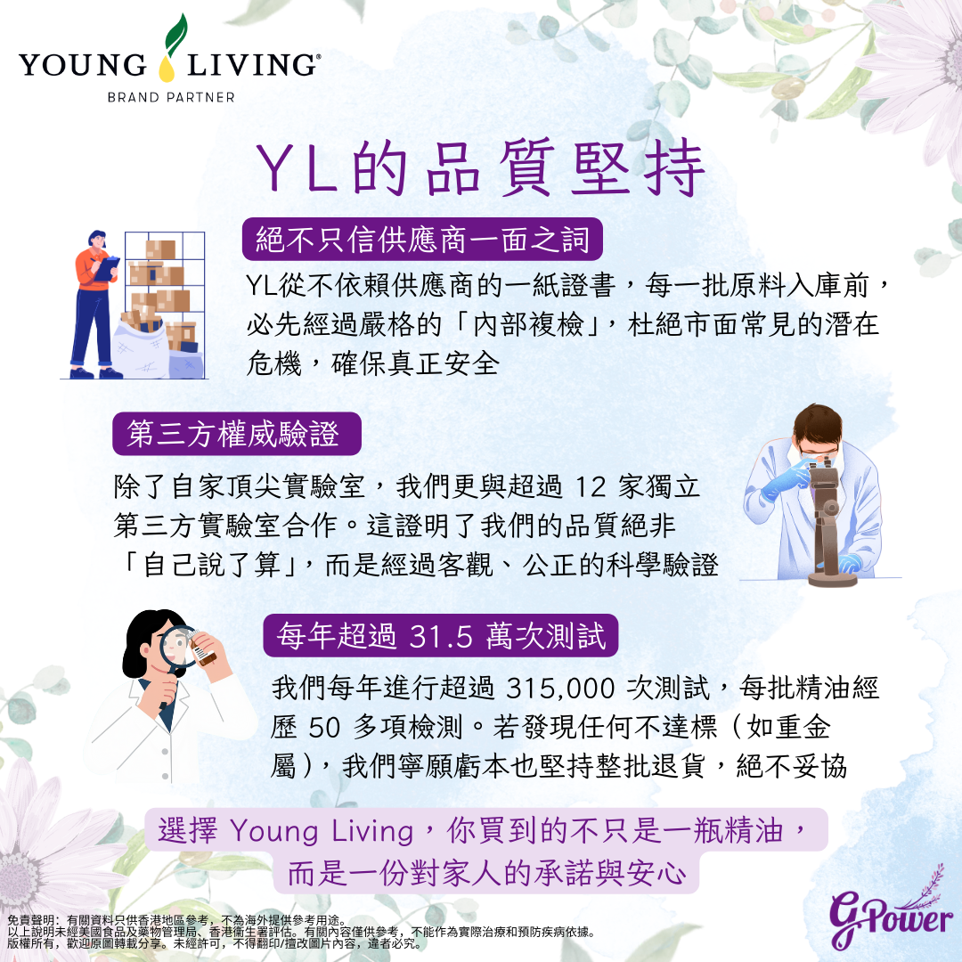 選擇 Young Living,你買到的不只是一瓶精油,而是一份對家人的承諾與安心。在充斥著化學隱憂的世代,讓我們用科學為你的健康把關。