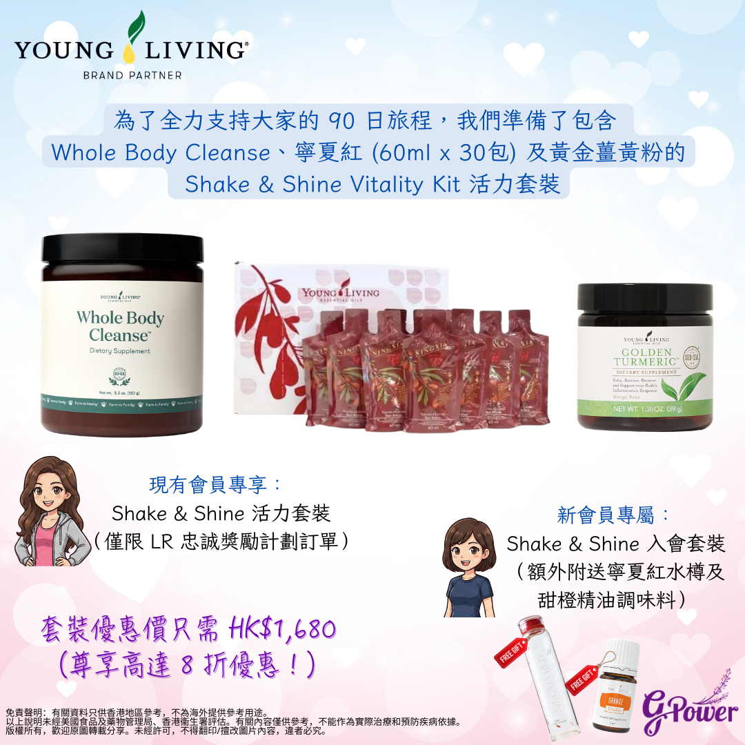為了全力支持大家的 90 日旅程,我們準備了包含 Whole Body Cleanse、黃金薑黃粉及寧夏紅 (60ml x 30包) 的Shake & Shine Vitality Kit 活力套裝 :