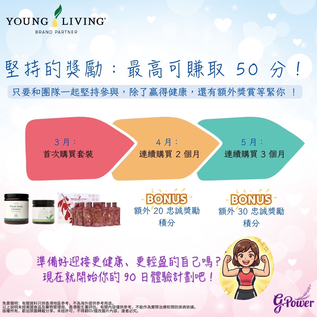 只要和團隊一起堅持參與,除了贏得健康,還有額外獎賞等緊你 ! 由 3 月起首次購買套裝 ,之後: