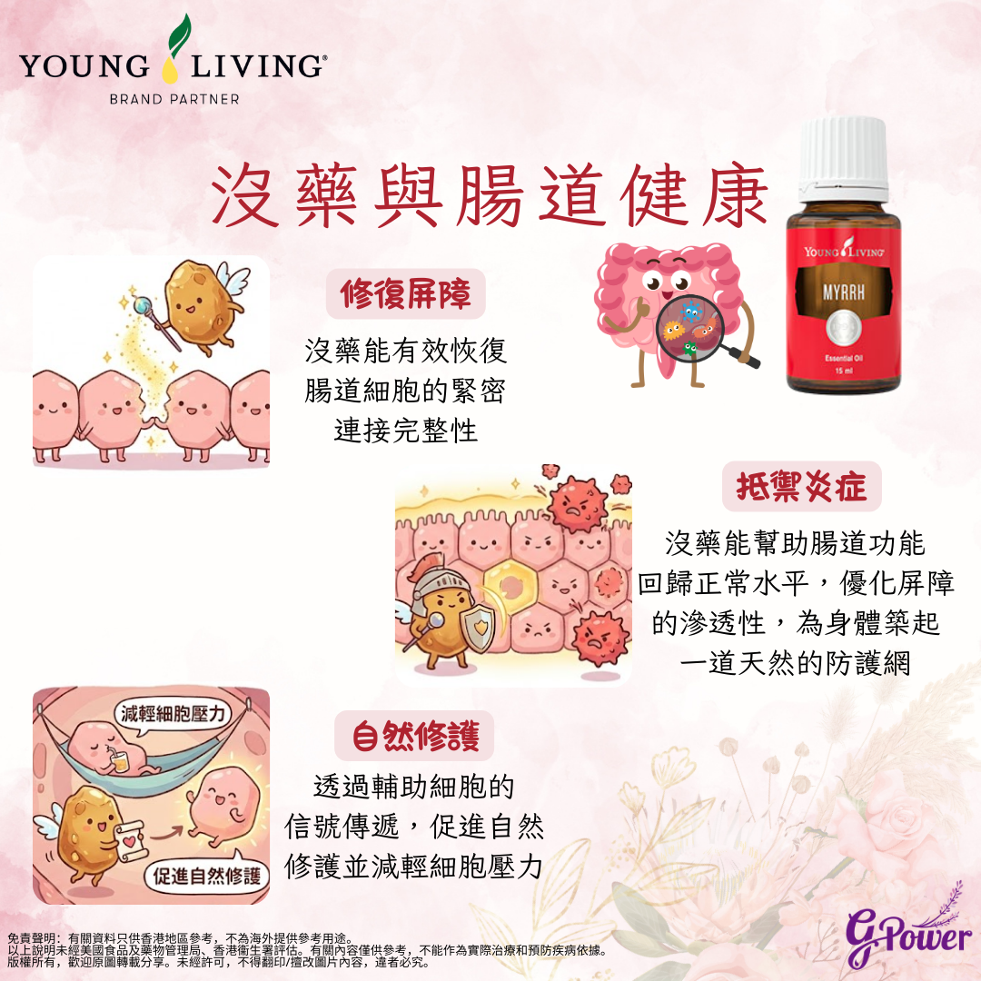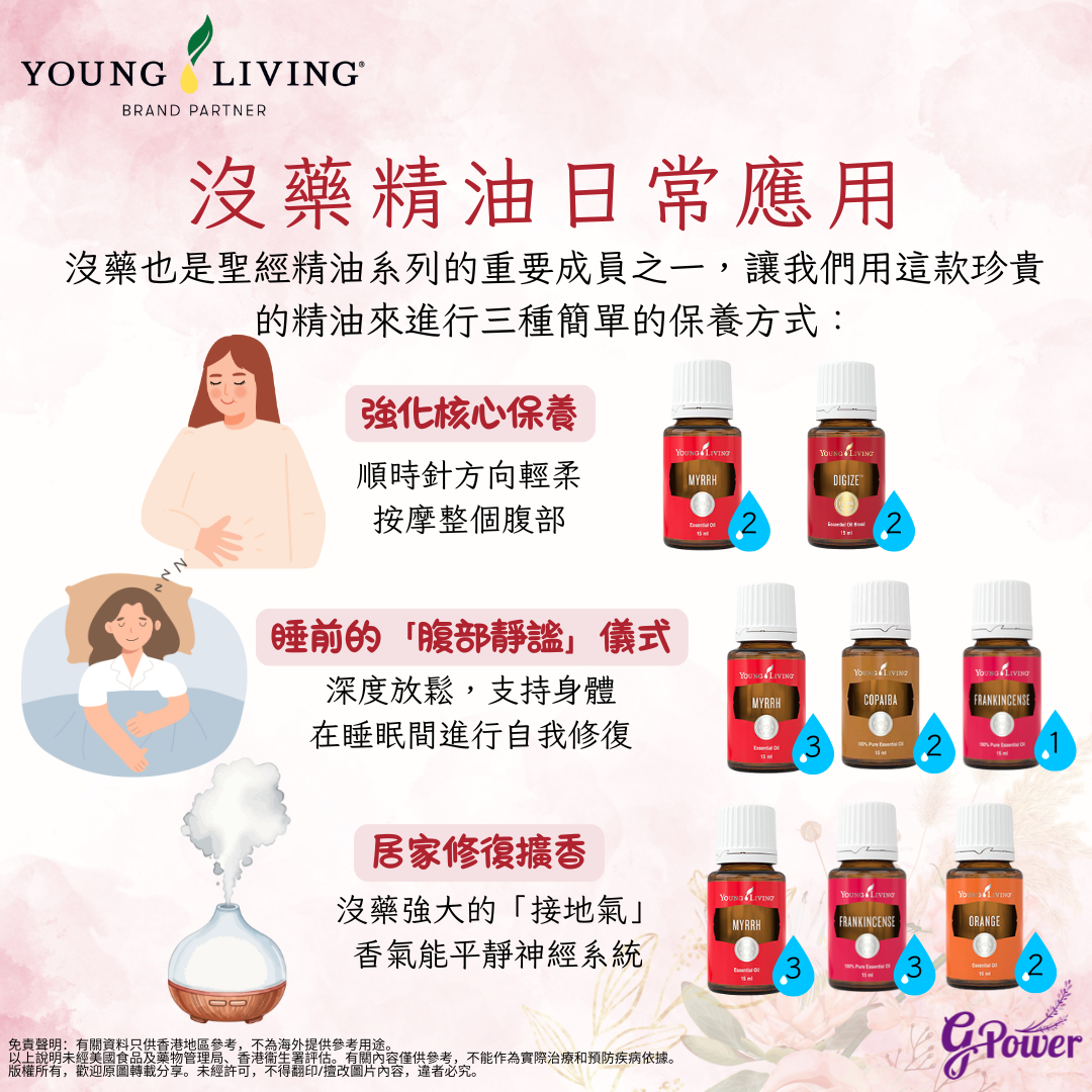 強化核心保養:腸道健康是全身活力的基礎,把 2 滴沒藥及 2 滴DiGize 以V-6 綜合純植物油稀釋,順時針方向輕柔按摩整個腹部