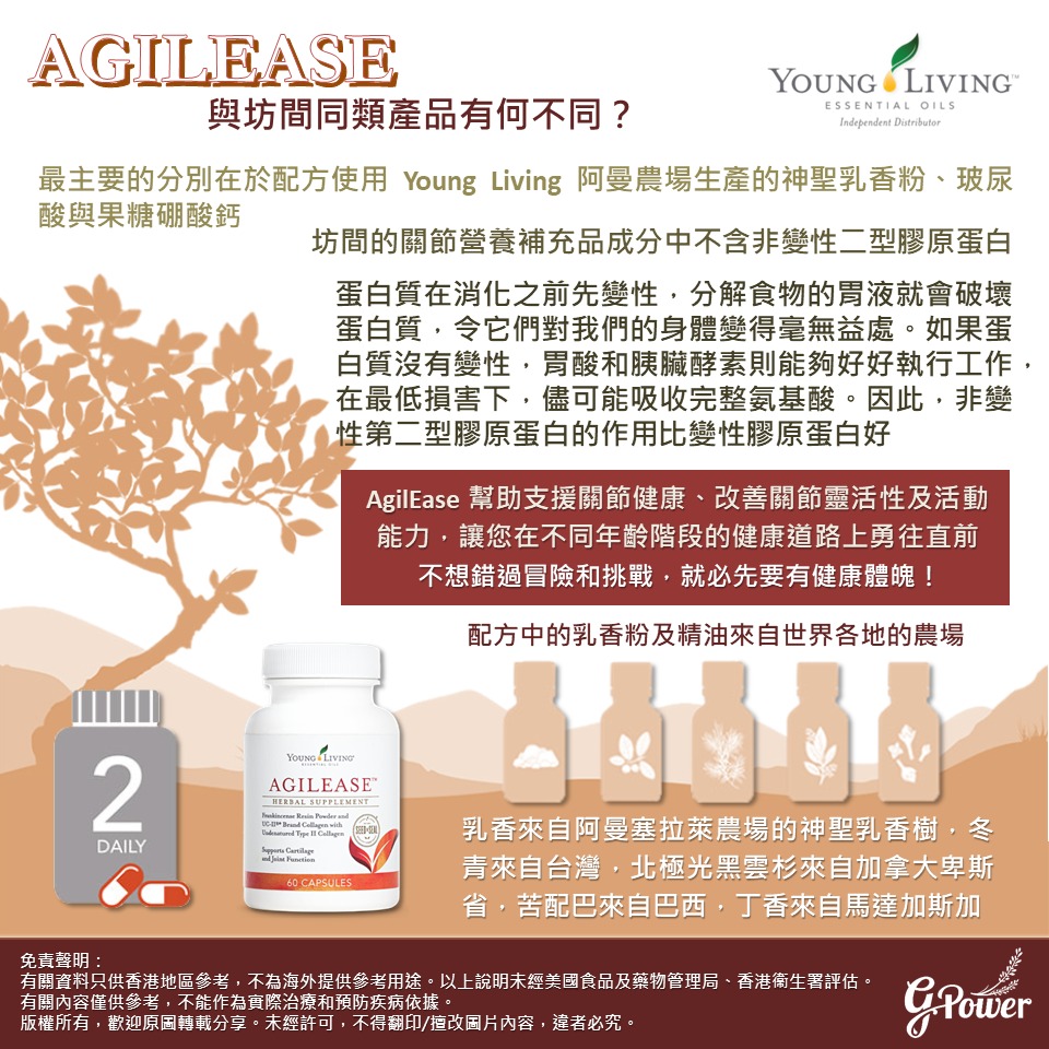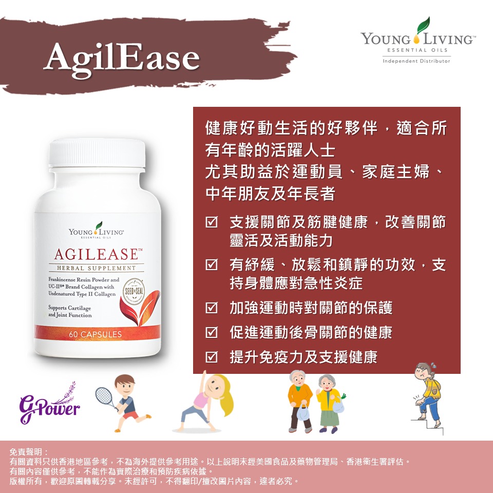AgilEase 蘊含多種植物成分,如乳香粉、多種天然精油及以非變性 (原型) 膠原蛋白,幫助支援關節及筋腱健康,而膠原蛋白之專利提取過程更可幫助維持醣蛋白的天然結構,令AgilEase 有別於坊間一般同類關節營養補充品,更有效改善關節靈活性及活動能力。💪💪