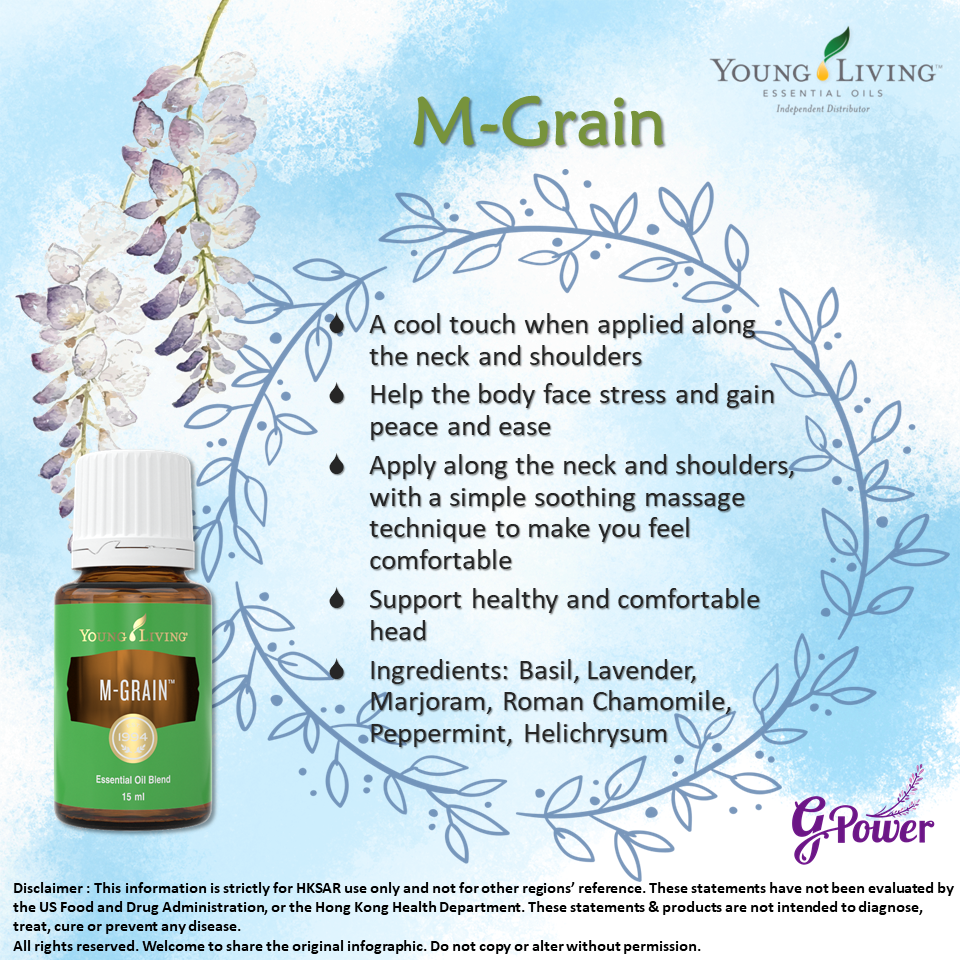 M-Grain精油有助於舒緩壓力,沿著頸部和肩部應用,具有舒緩、放鬆的作用。