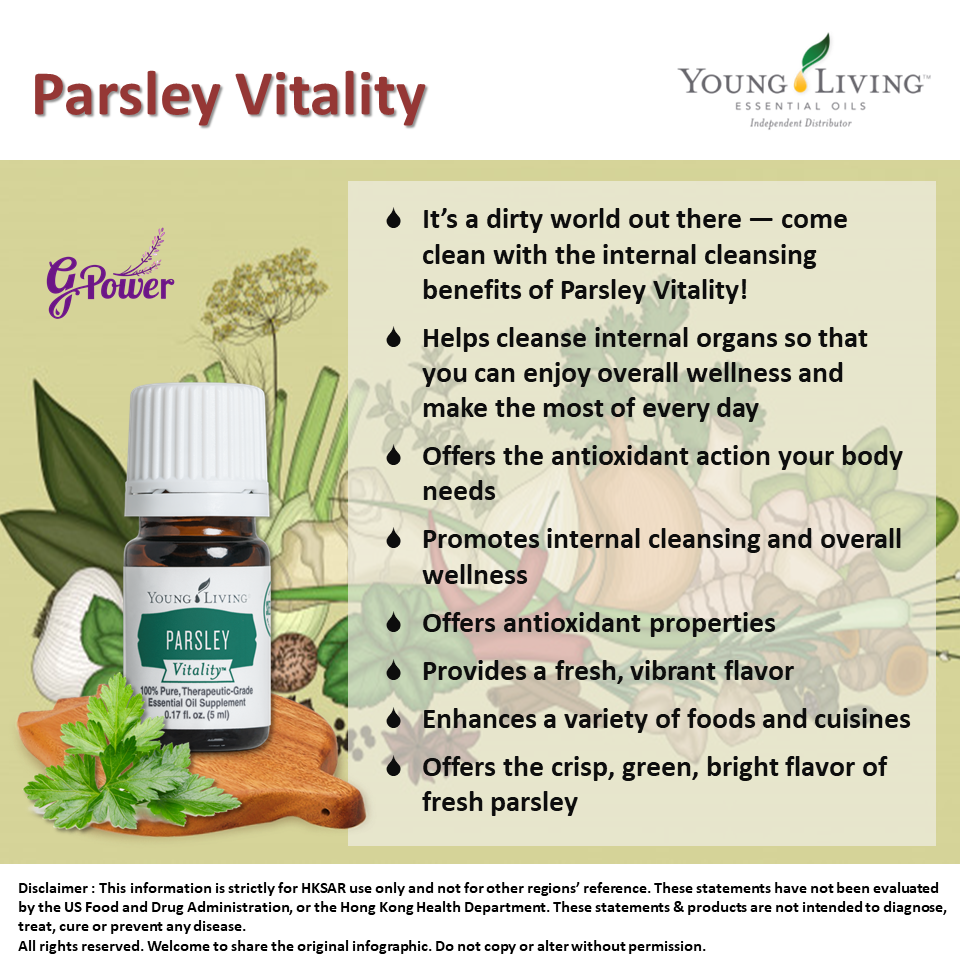 It’s a dirty world out there—come clean with the internal cleansing benefits of Parsley Vitality™! From environment to diet, life is full of toxins and other nasties that can keep you from feeling your best. But with a daily drop of Parsley Vitality, you can take advantage of the benefits of this EO triple threat: internal cleansing, antioxidant properties, and overall wellness. Plus, just a drop delivers all the crisp, green, bright flavor of fresh parsley, one of the most beloved culinary herbs in the world.