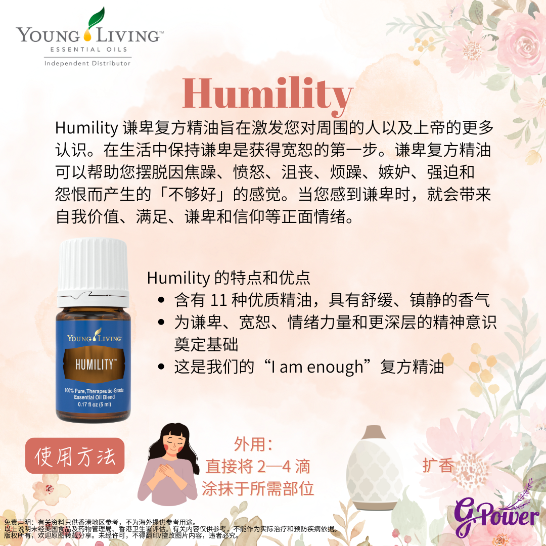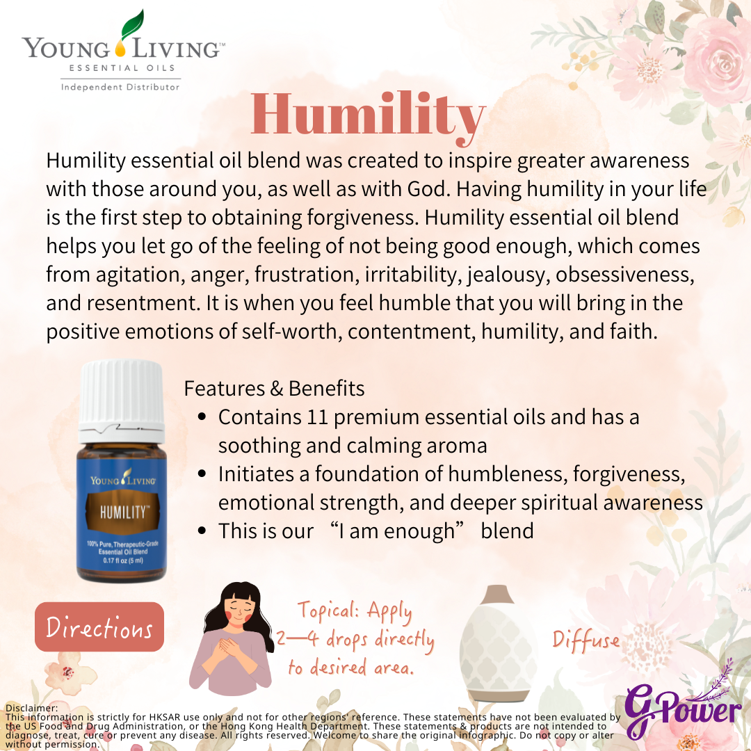 Humility 謙卑複方精油旨在激發您對周圍的人以及上帝的更多認識。在生活中保持謙卑是獲得寬恕的第一步。謙卑複方精油可以幫助您擺脫因焦躁、憤怒、沮喪、煩躁、嫉妒、強迫和怨恨而產生的「不夠好」的感覺。當您感到謙卑時,就會帶來自我價值、滿足、謙卑和信仰等正面情緒。