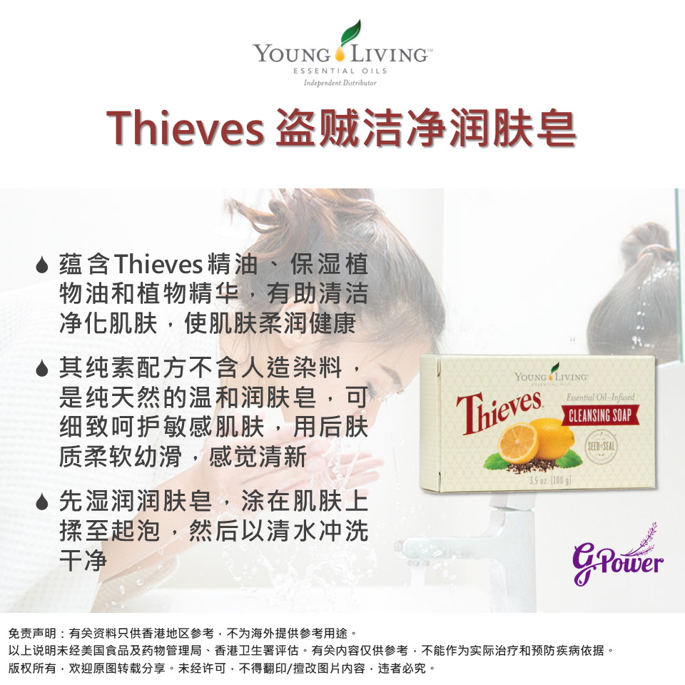 Thieves®盜賊潔淨潤膚皂蘊含Thieves精油及天然植物萃取,有助清潔淨化肌膚,使肌膚柔潤健康。其純素配方更不含人造染料,是純天然的溫和潤膚皂,可細緻呵護敏感肌膚,用後膚質柔軟幼滑,感覺清新。