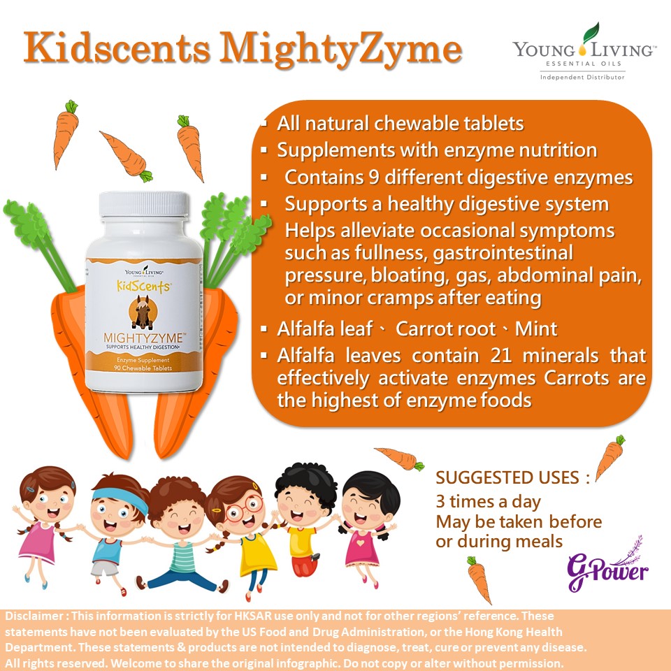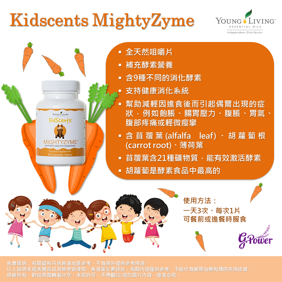 KidScents MightyZyme含有天然存在於人體的酵素,有助於支持兒童日益增長的消化需要。