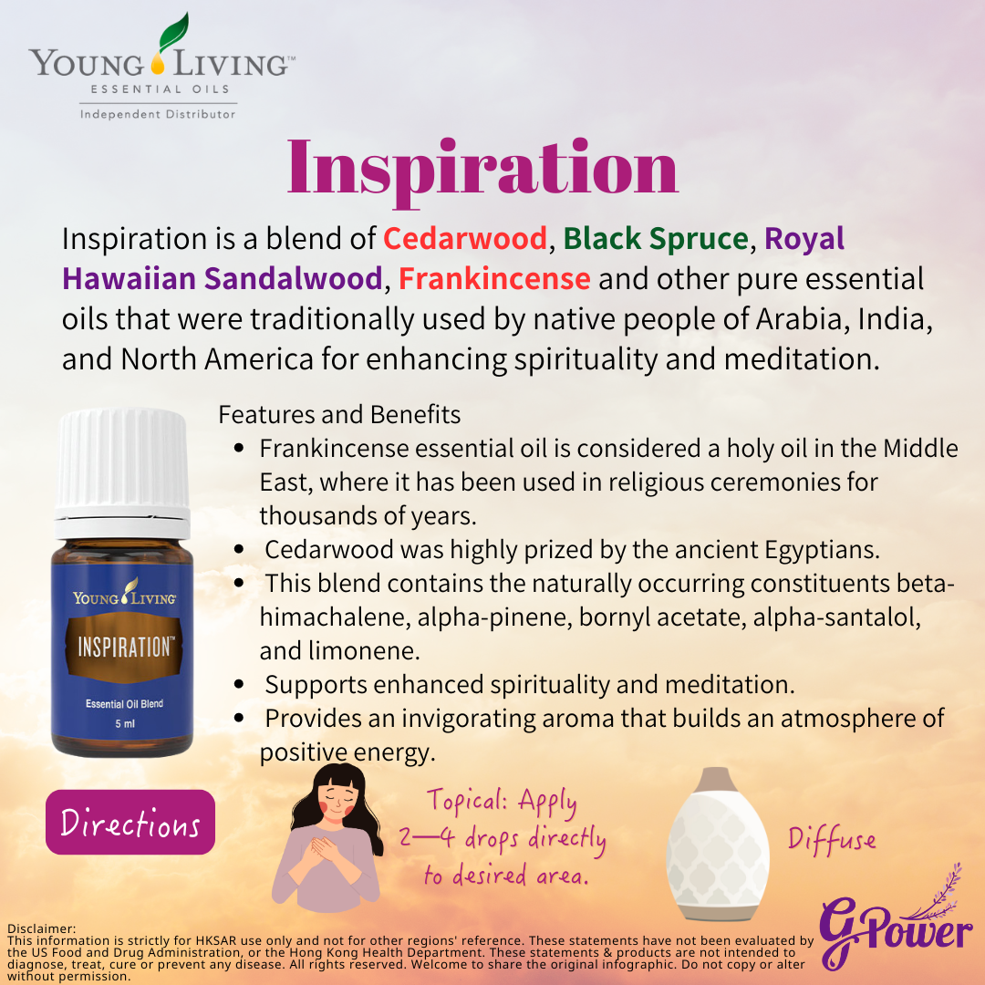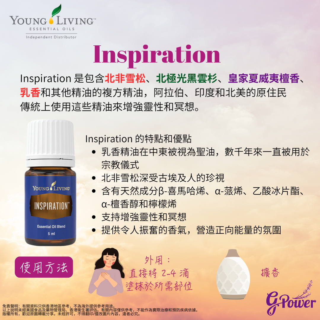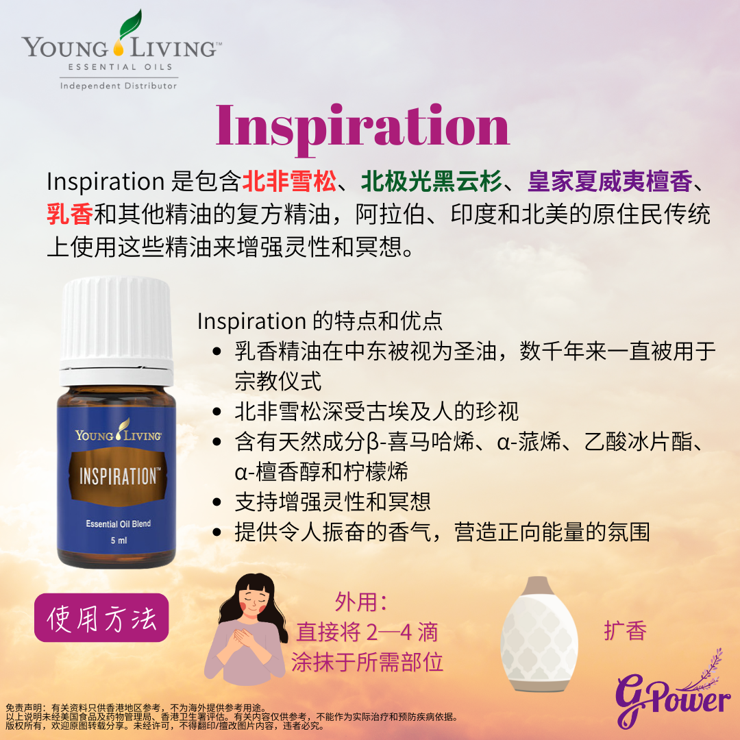 Inspiration 是包含北非雪松、北極光黑雲杉、皇家夏威夷檀香、乳香和其他精油的複方精油,阿拉伯、印度和北美的原住民傳統上使用這些精油來增強靈性和冥想。