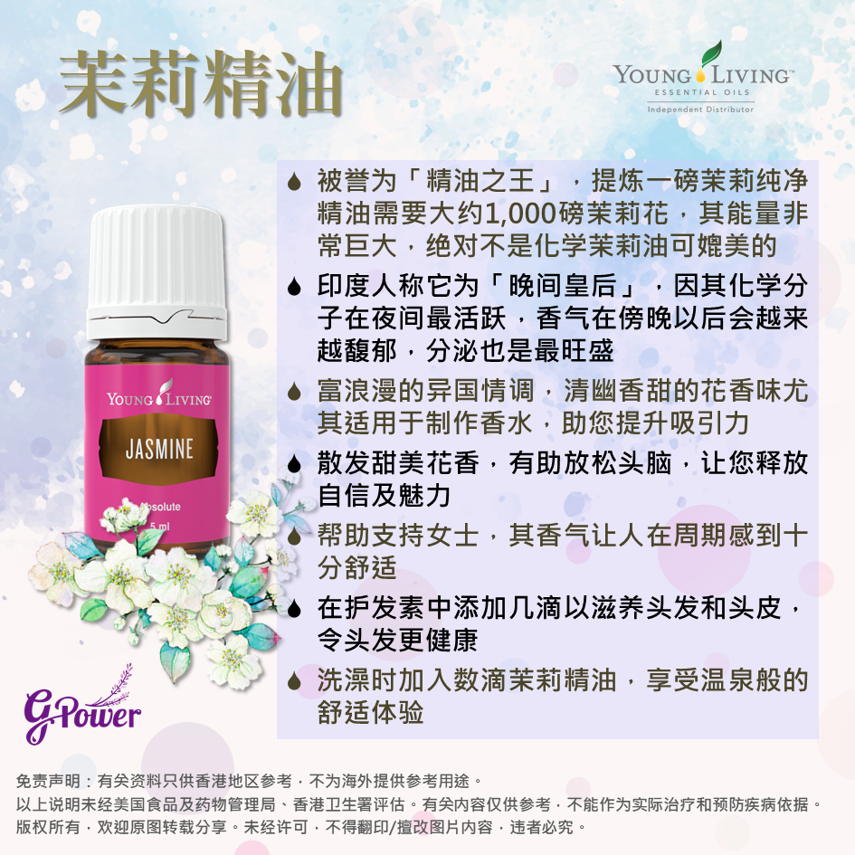 茉莉精油散發甜美花香,有助放鬆頭腦,讓您釋放自信及魅力。茉莉精油富浪漫的異國情調,其清幽香甜的花香味尤其適用於製作香水,助您提升吸引力。