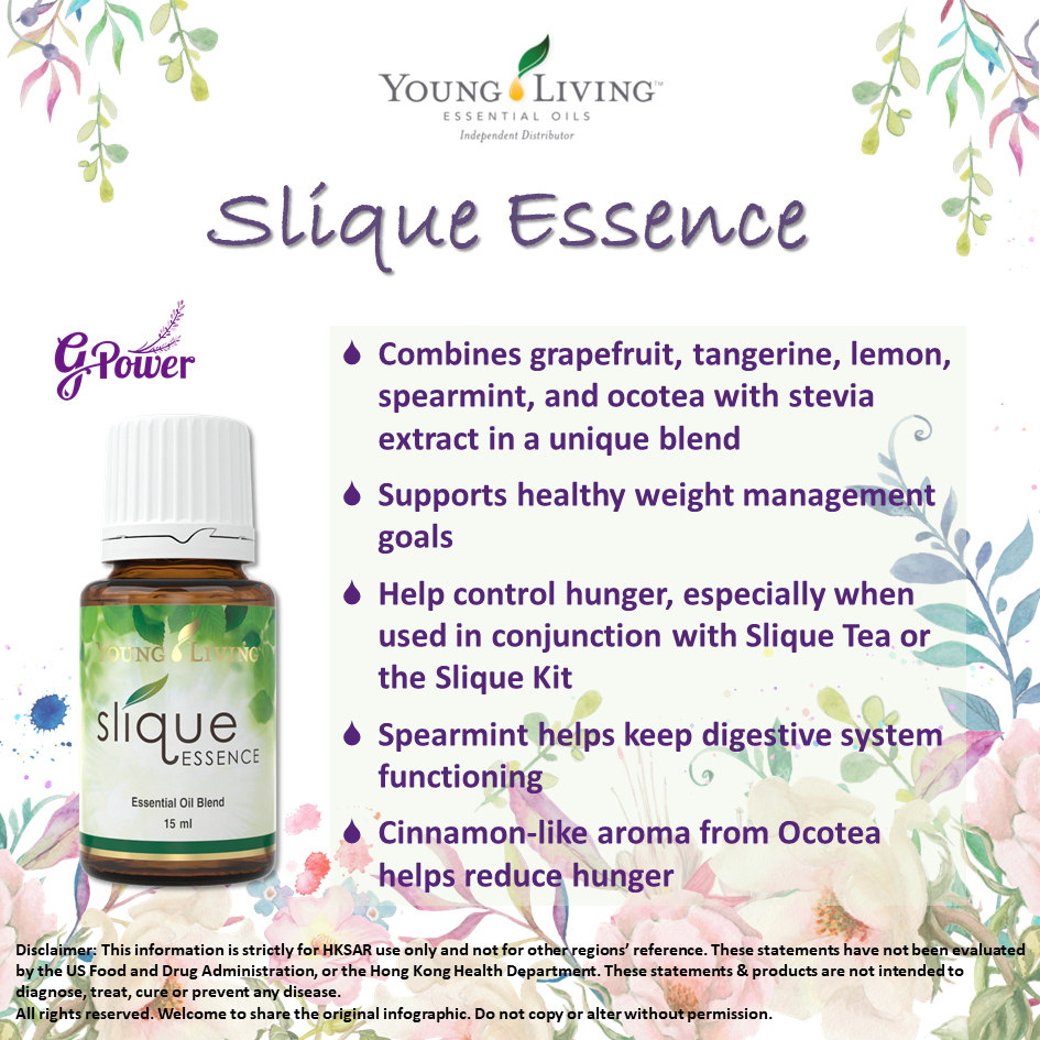Slique複方精油的獨特配方蘊含西柚、柑橘、檸檬、綠薄荷、奥寇梯木及甜菊糖。以上成分相互發揮協同作用,為身體提供飽腹感。配合Slique Tea或Slique套裝使用更有效減低食慾,支援健康體重管理。 其柑橘類精油成分使氣味芳香怡人;綠薄荷幫助維持消化系統正常運作*;奥寇梯木精油散發肉桂般的香氣有助減輕饑餓感。配方更採用天然甜味劑甜菊糖,令味道香甜而不會增加熱量。