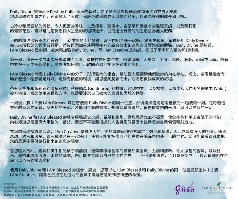 The Divine Destiny Collection features three essential oil blends designed to be layered and applied topically: Daily Divine™, I Am Blessed™, and I Am Creative™. The essential oil blends in this collection are formulated to help heighten spiritual awareness and empower your inner self by blocking out distractions, words, and programing that keep you from discovering the truth of who you are.