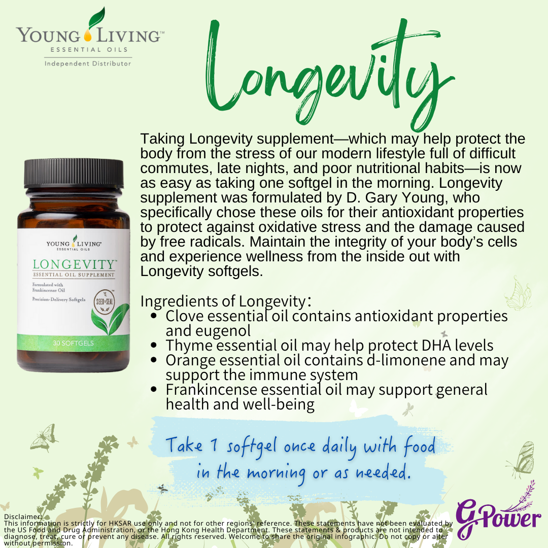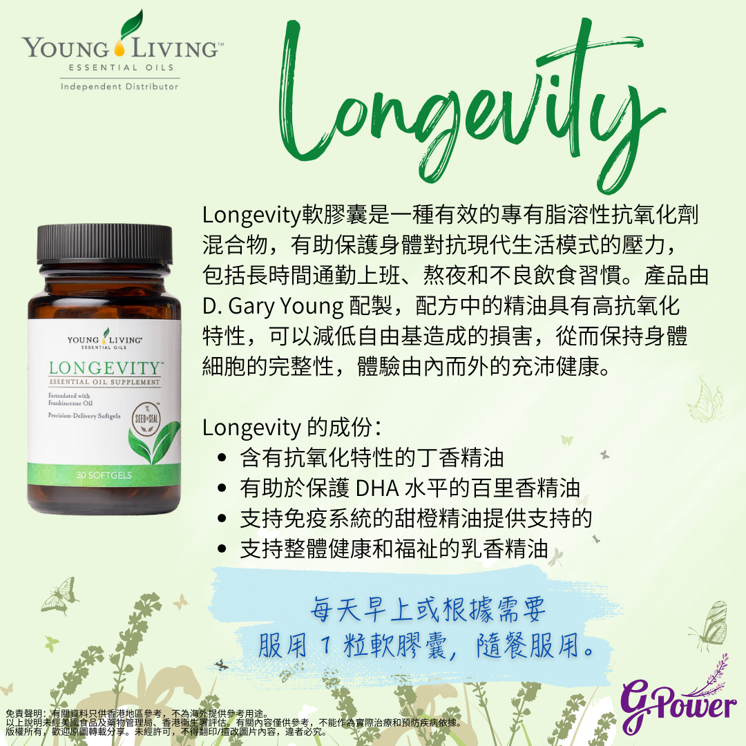Longevity軟膠囊是一種有效的專有脂溶性抗氧化劑混合物,有助保護身體對抗現代生活模式的壓力,包括長時間通勤上班、熬夜和不良飲食習慣。產品由 D. Gary Young 配製,配方中的精油具有高抗氧化特性,可以減低自由基造成的損害,從而保持身體細胞的完整性,體驗由內而外的充沛健康。