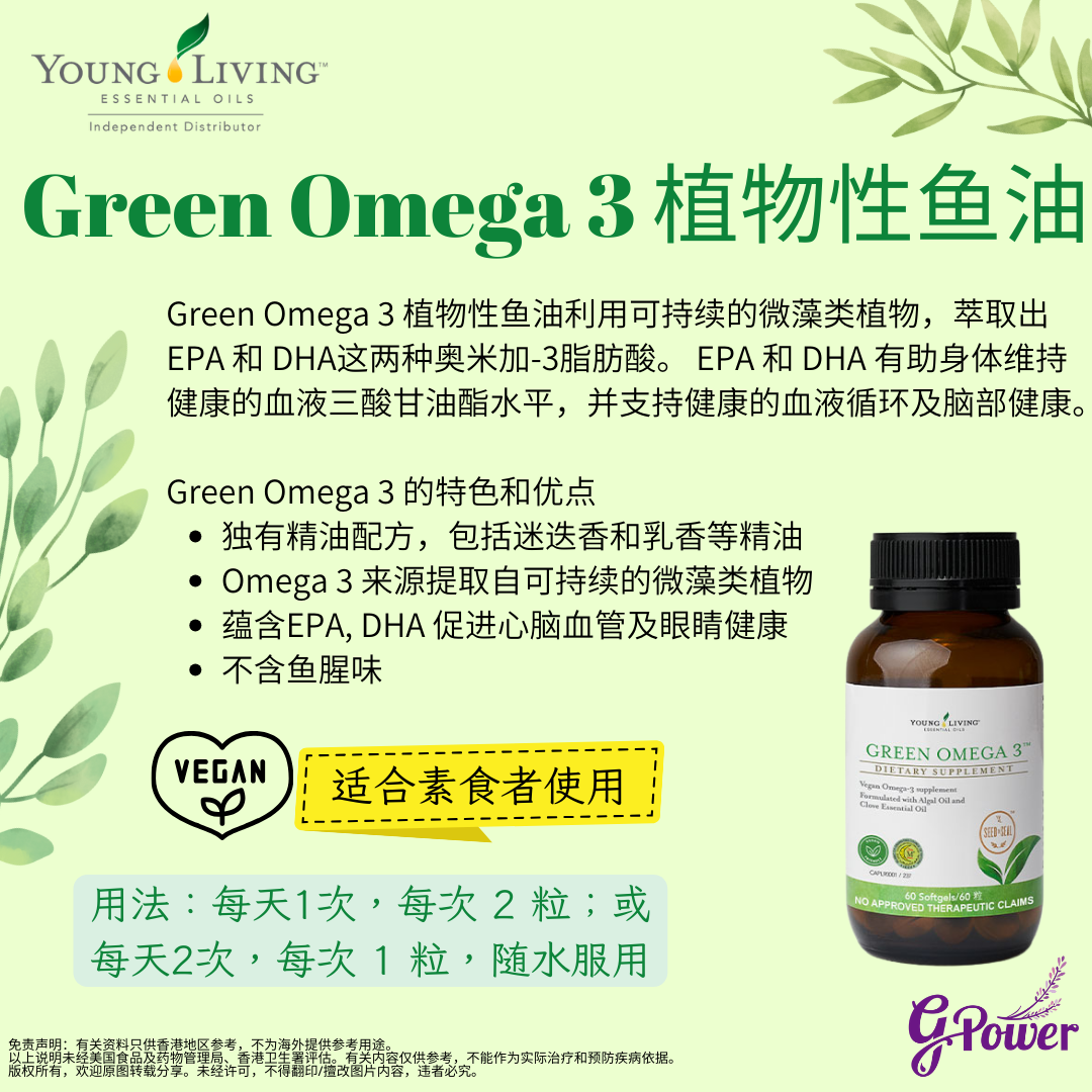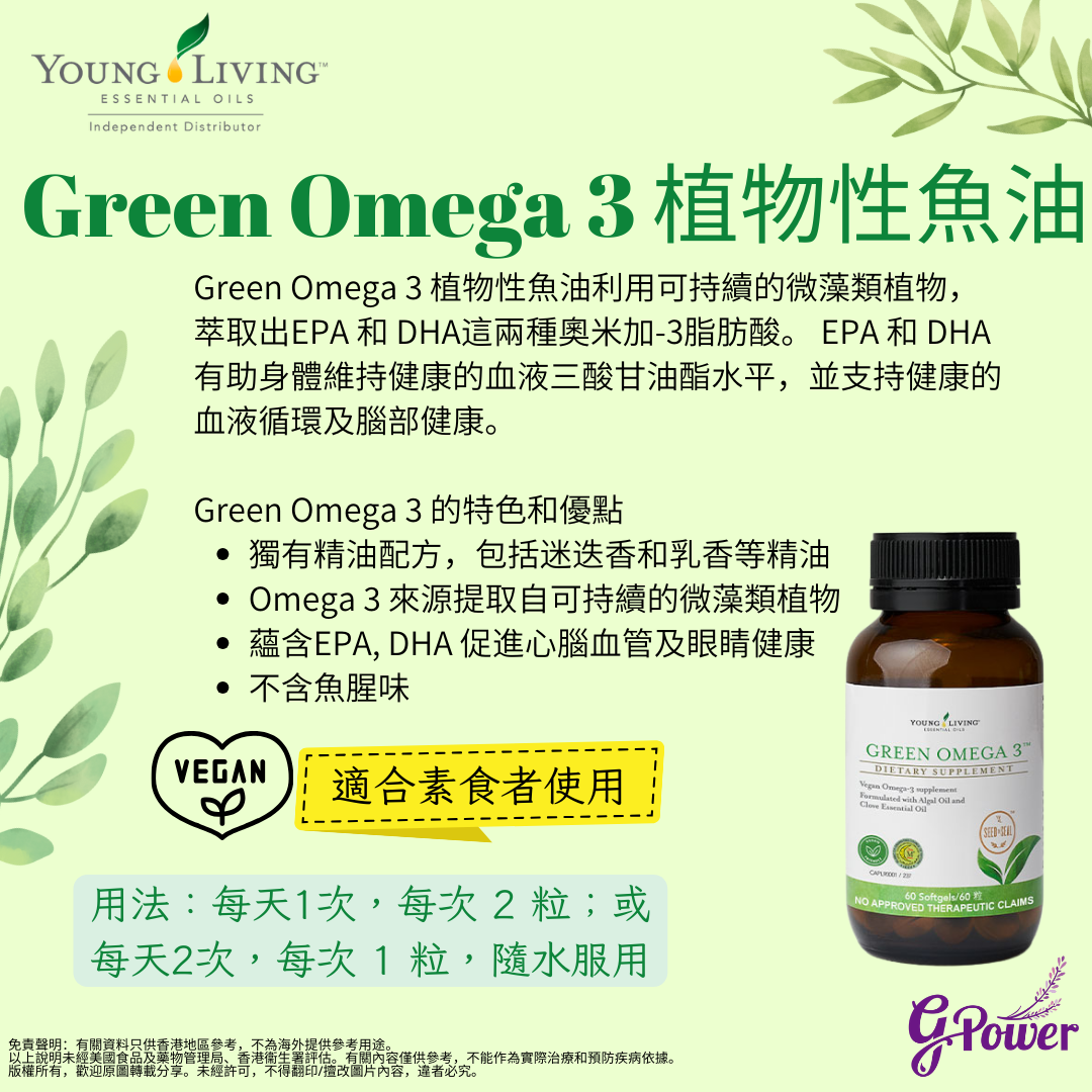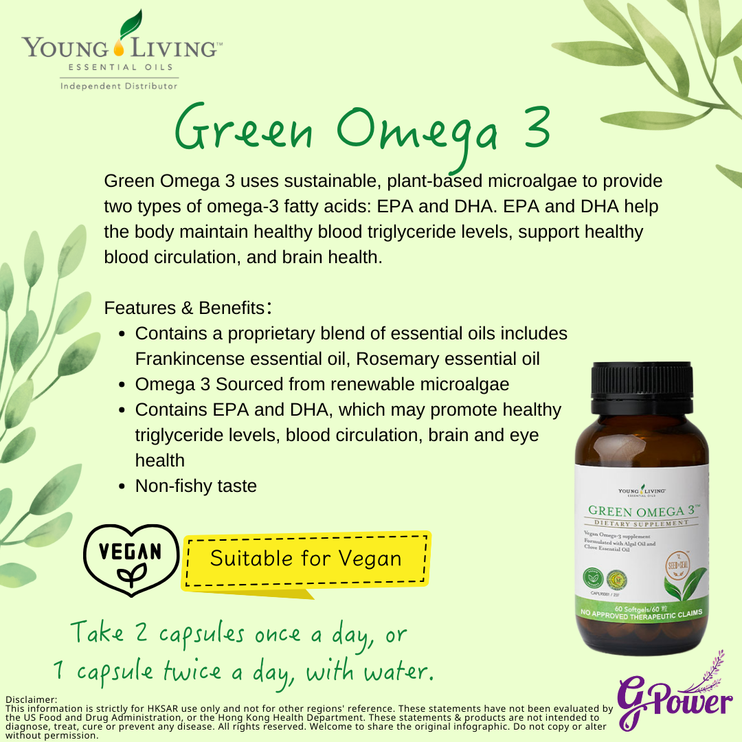 Green Omega 3 植物性魚油利用可持續的微藻類植物,萃取出EPA 和 DHA這兩種奧米加-3脂肪酸。 EPA 和 DHA 有助身體維持健康的血液三酸甘油酯水平,並支持健康的血液循環及腦部健康。