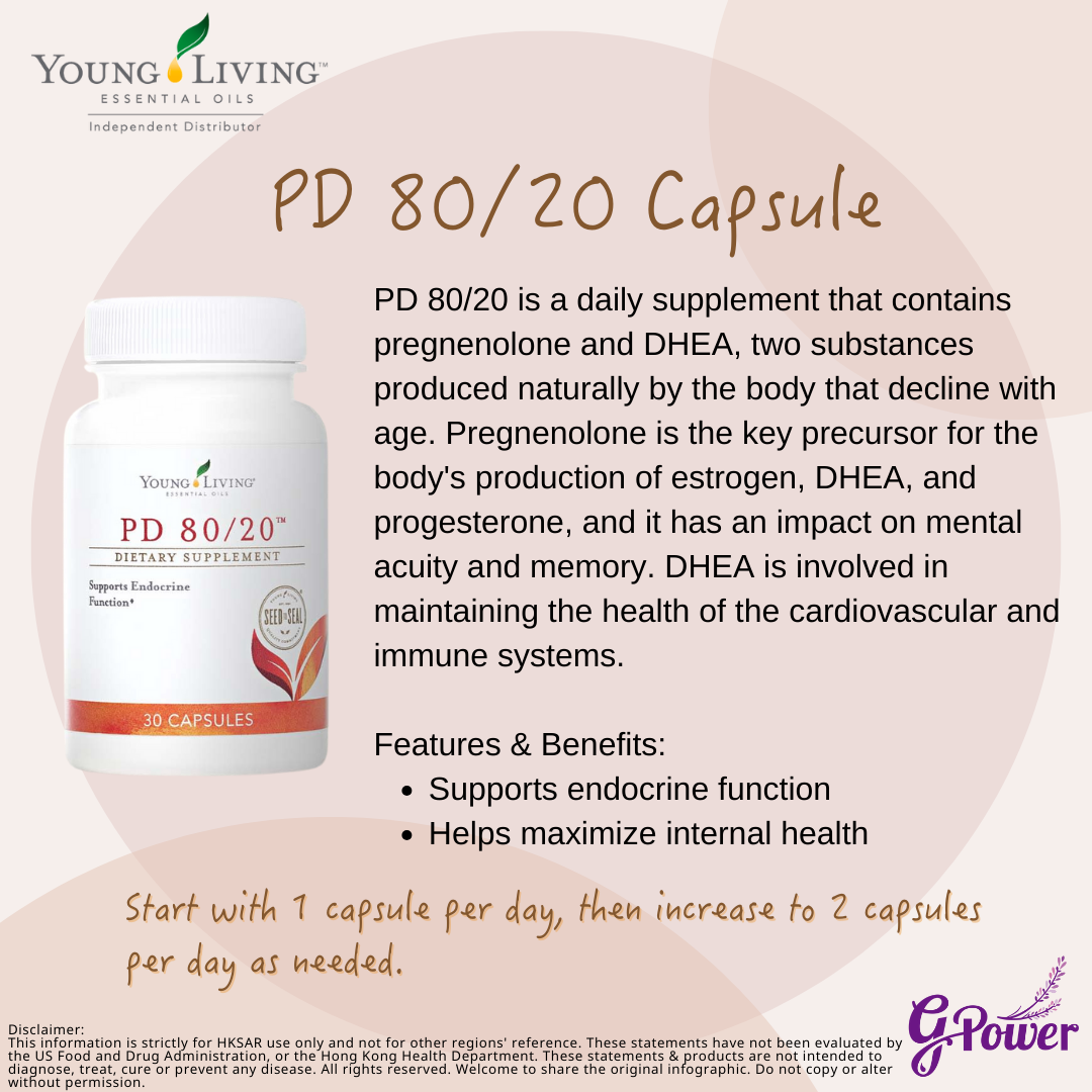 PD 80/20 是一種每日補充劑,含有孕烯醇酮(pregnenolone)和 DHEA,這兩種物質是人體自然產生的,但會隨著年齡的增長而減少。孕烯醇酮是人體產生雌激素、DHEA 和黃體酮的關鍵,它對精神敏銳度和記憶力有影響。 DHEA 能維持心血管和免疫系統的健康。