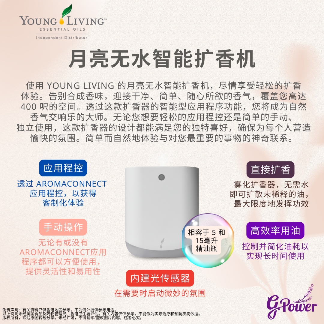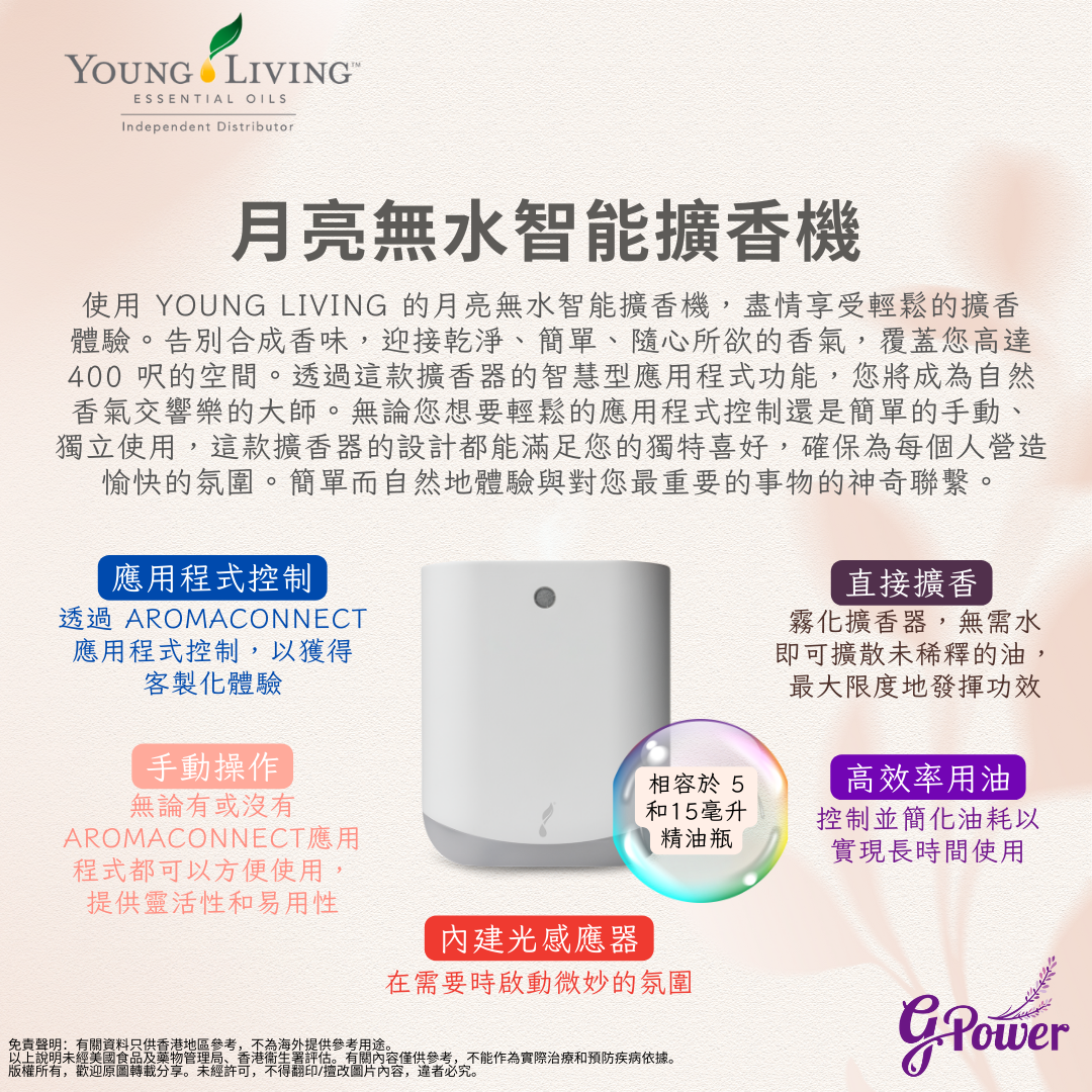 使用 Young Living 的月亮無水智能擴香機,盡情享受輕鬆的擴香體驗。告別合成香味,迎接乾淨、簡單、隨心所欲的香氣,覆蓋您高達 400 呎的空間。透過這款擴香器的智慧型應用程式功能,您將成為自然香氣交響樂的大師。無論您想要輕鬆的應用程式控制還是簡單的手動、獨立使用,這款擴香器的設計都能滿足您的獨特喜好,確保為每個人營造愉快的氛圍。簡單而自然地體驗與對您最重要的事物的神奇聯繫。