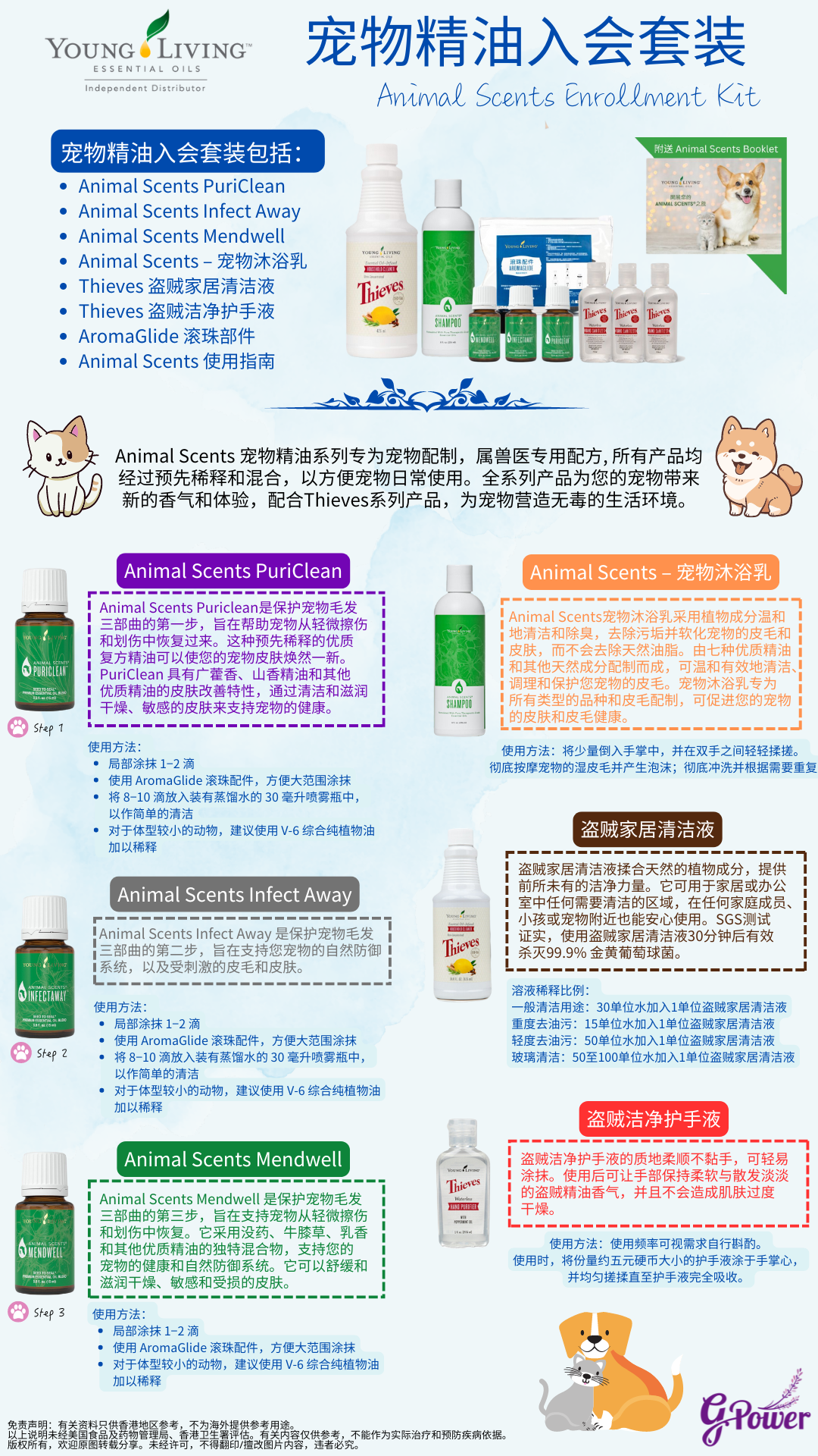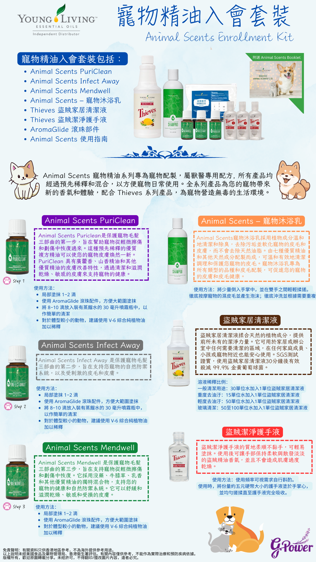 Animal Scents 寵物精油系列專為寵物配製,屬獸醫專用配方, 所有產品均經過預先稀釋和混合,以方便寵物日常使用。全系列產品為您的寵物帶來新的香氣和體驗,配合Thieves系列產品,為寵物營造無毒的生活環境。