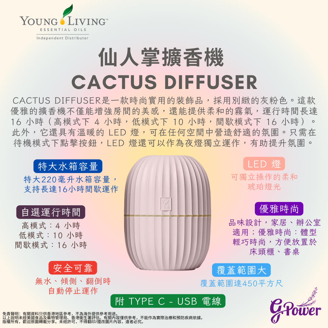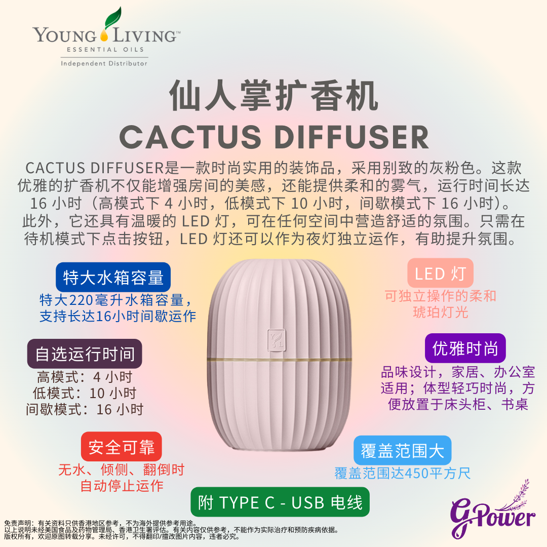 Cactus Diffuser是一款時尚實用的裝飾品,採用別緻的灰粉色。這款優雅的擴香機不僅能增強房間的美感,還能提供柔和的霧氣,運行時間長達 16 小時(高模式下 4 小時,低模式下 10 小時,間歇模式下 16 小時)。此外,它還具有溫暖的 LED 燈,可在任何空間中營造舒適的氛圍。只需在待機模式下點擊按鈕,LED 燈還可以作為夜燈獨立運作,有助提升氛圍。