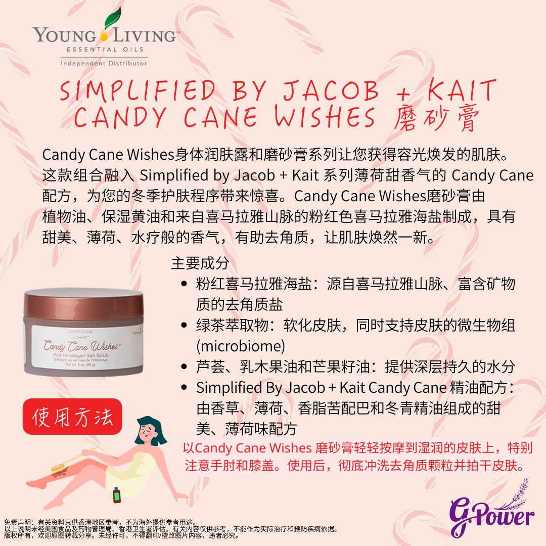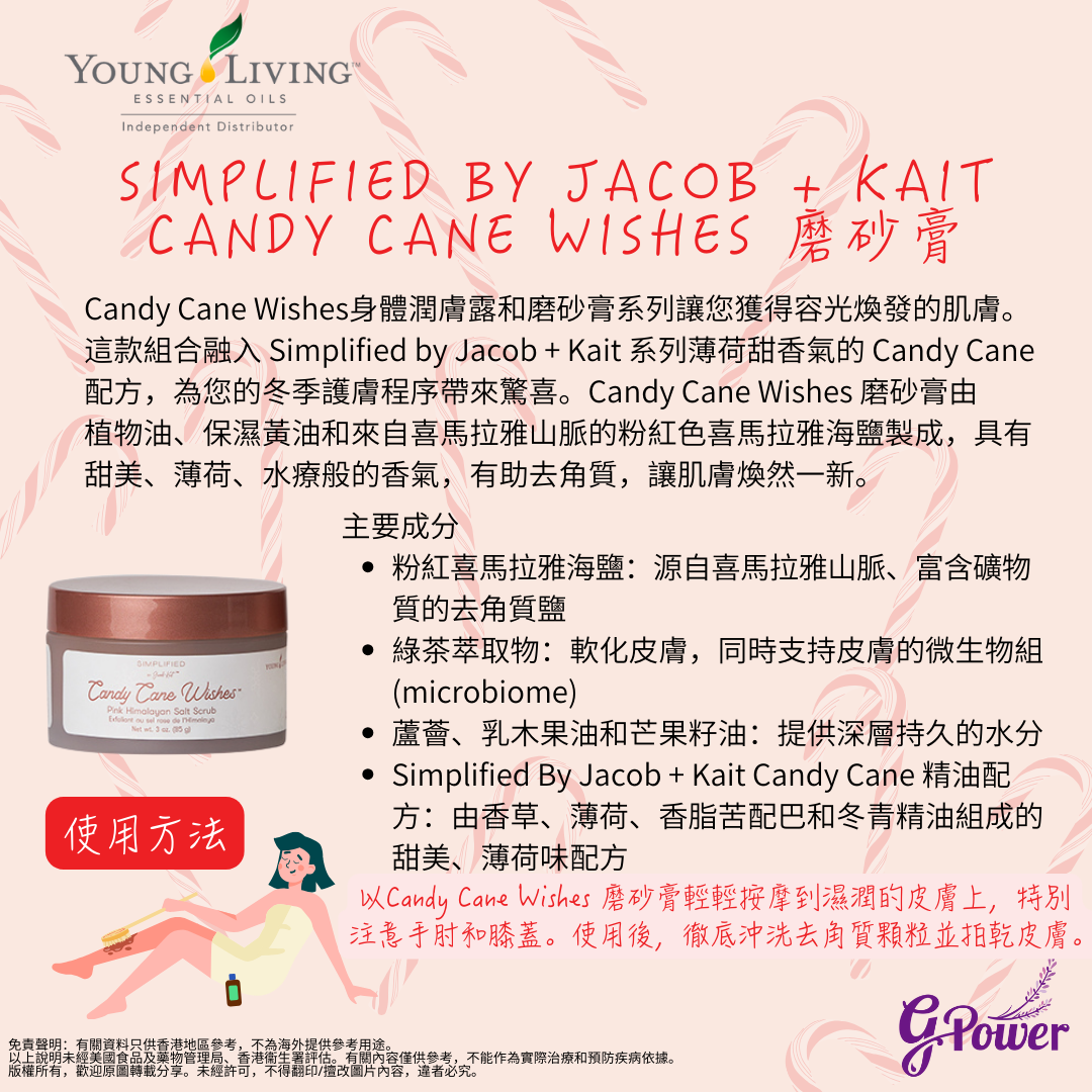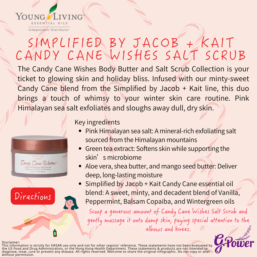 Candy Cane Wishes身體潤膚露和磨砂膏系列讓您獲得容光煥發的肌膚。這款組合融入 Simplified by Jacob + Kait 系列薄荷甜香氣的 Candy Cane 配方,為您的冬季護膚程序帶來驚喜。Candy Cane Wishes磨砂膏由植物油、保濕黃油和來自喜馬拉雅山脈的粉紅色喜馬拉雅海鹽製成,具有甜美、薄荷、水療般的香氣,有助去角質,讓肌膚煥然一新。