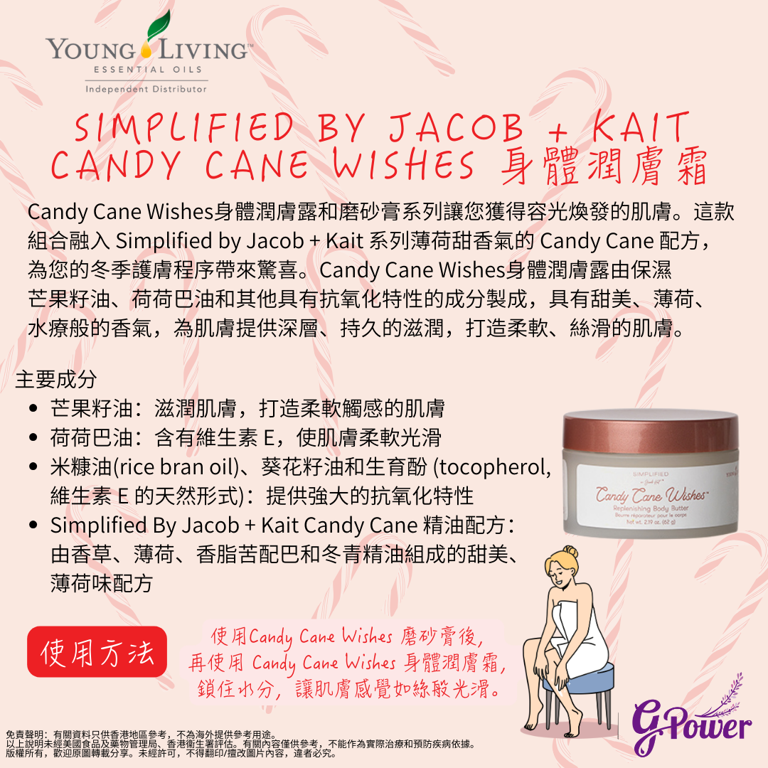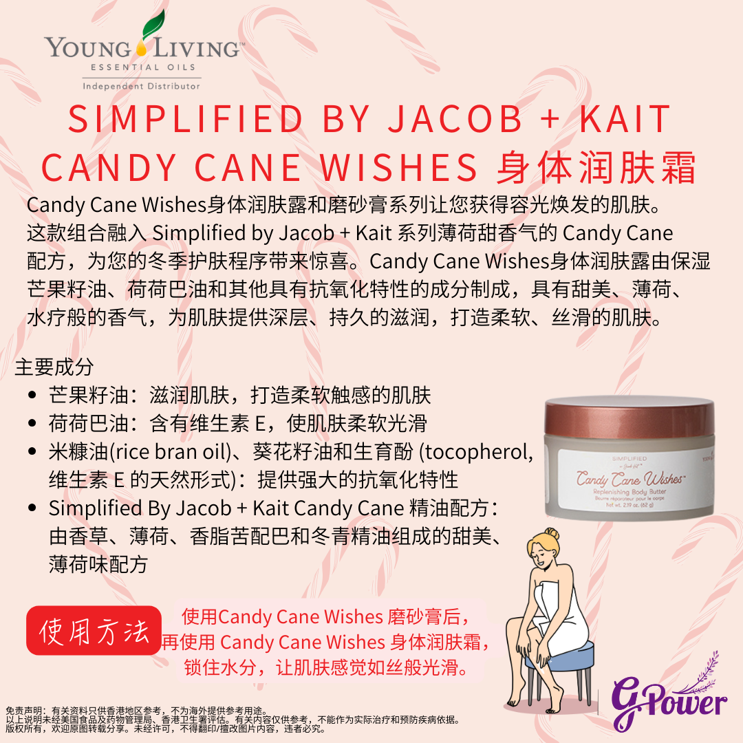Candy Cane Wishes身體潤膚露和磨砂膏系列讓您獲得容光煥發的肌膚。這款組合融入 Simplified by Jacob + Kait 系列薄荷甜香氣的 Candy Cane 配方,為您的冬季護膚程序帶來驚喜。Candy Cane Wishes身體潤膚露由保濕芒果籽油、荷荷巴油和其他具有抗氧化特性的成分製成,具有甜美、薄荷、水療般的香氣,為肌膚提供深層、持久的滋潤,打造柔軟、絲滑的肌膚。
