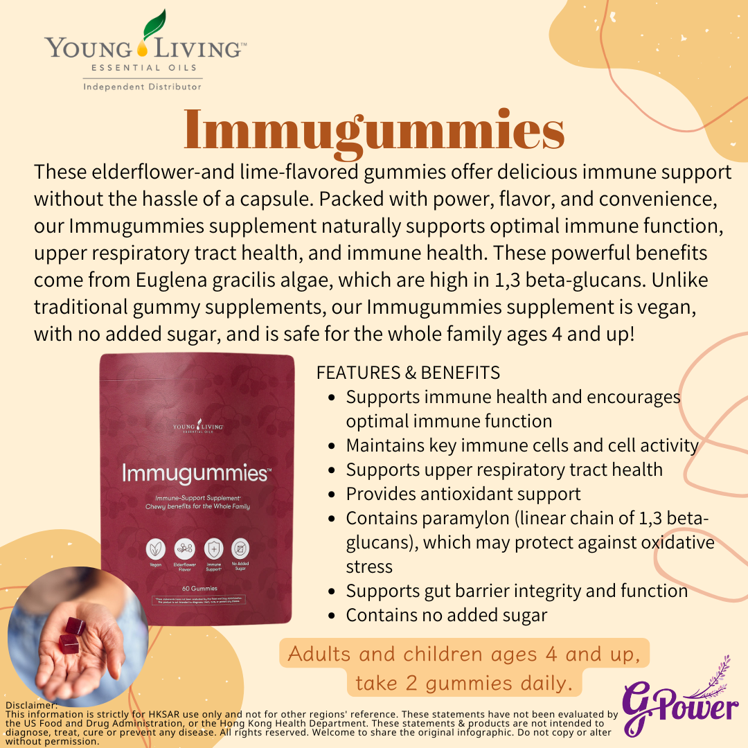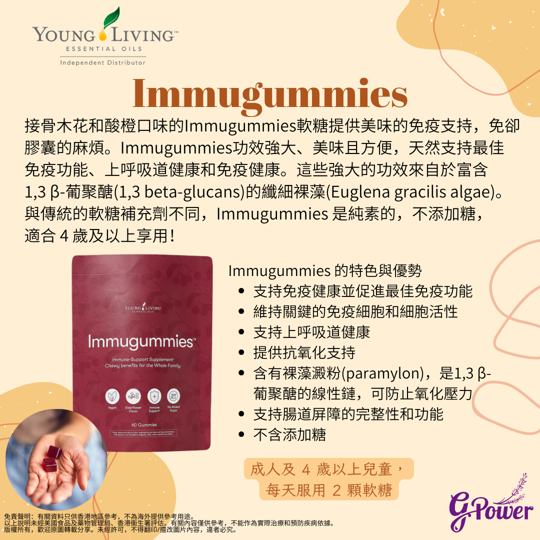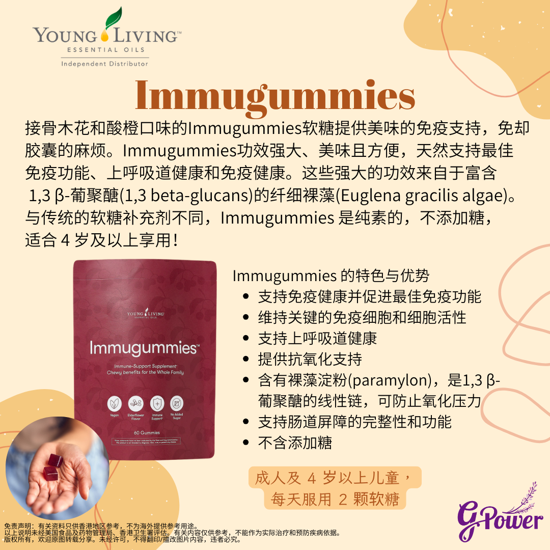 接骨木花和酸橙口味的Immugummies軟糖提供美味的免疫支持,免卻膠囊的麻煩。Immugummies功效強大、美味且方便,天然支持最佳免疫功能、上呼吸道健康和免疫健康。這些強大的功效來自於富含 1,3 β-葡聚醣(1,3 beta-glucans)的纖細裸藻(Euglena gracilis algae)。與傳統的軟糖補充劑不同,Immugummies 是純素的,不添加糖,適合 4 歲及以上享用!