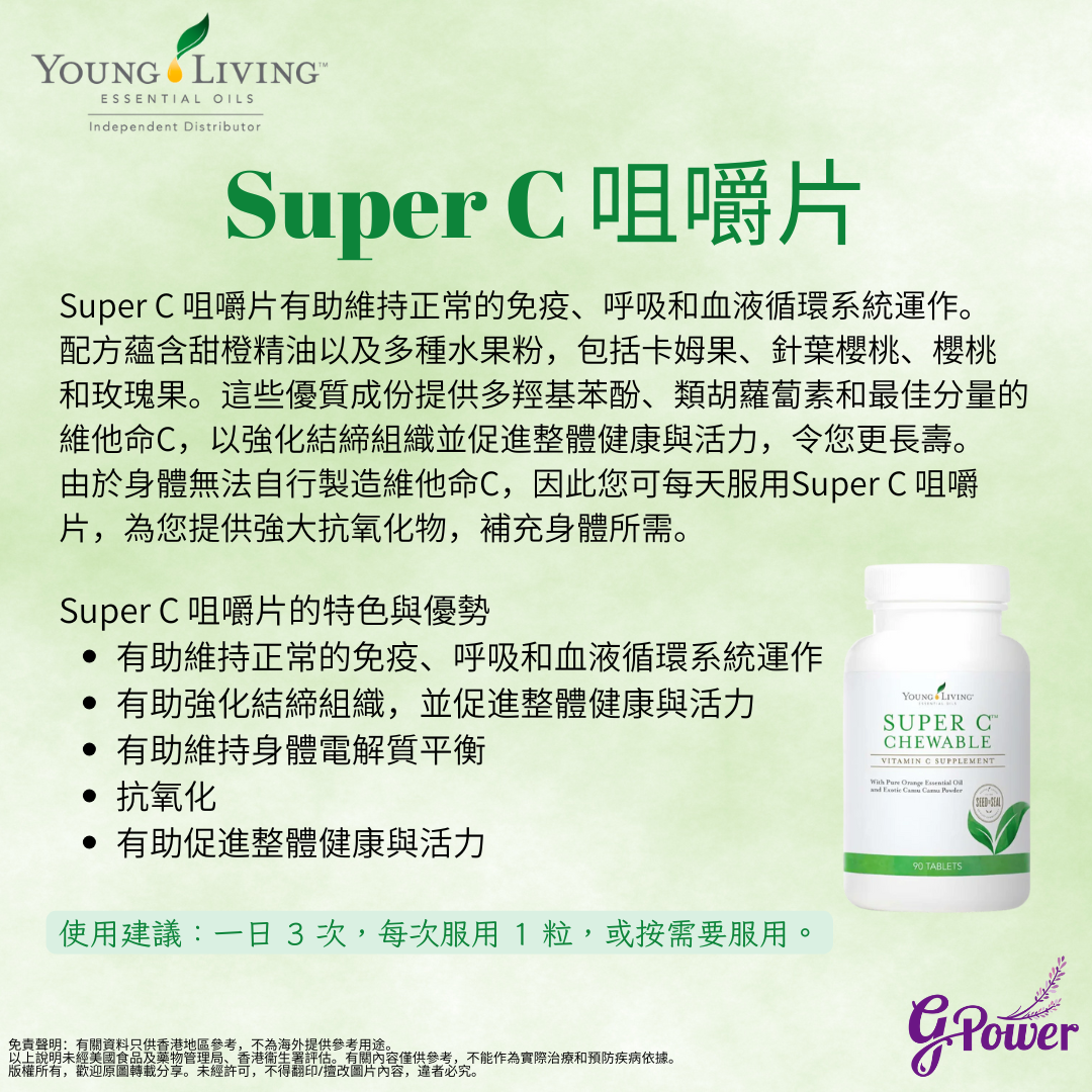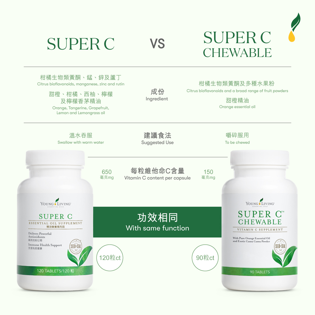 Super C 咀嚼片有助維持正常的免疫、呼吸和血液循環系統運作。配方蘊含甜橙精油以及多種水果粉,包括卡姆果、針葉櫻桃、櫻桃和玫瑰果。這些優質成份提供多羥基苯酚、類胡蘿蔔素和最佳分量的維他命C,以強化結締組織並促進整體健康與活力,令您更長壽。 由於身體無法自行製造維他命C,因此您可每天服用Super C 咀嚼片,為您提供強大抗氧化物,補充身體所需。