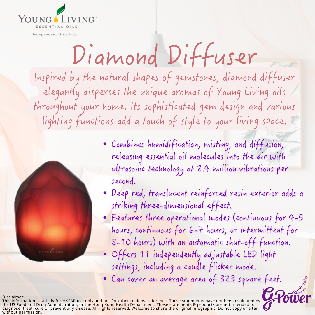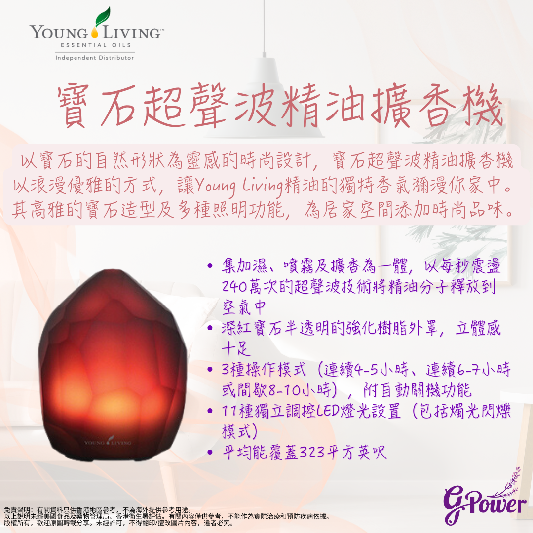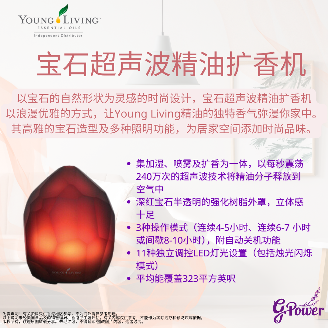 以寶石的自然形狀為靈感的時尚設計,寶石超聲波精油擴香機以浪漫優雅的方式,讓Young Living精油的獨特香氣瀰漫你家中。其高雅的寶石造型及多種照明功能,為居家空間添加時尚品味。